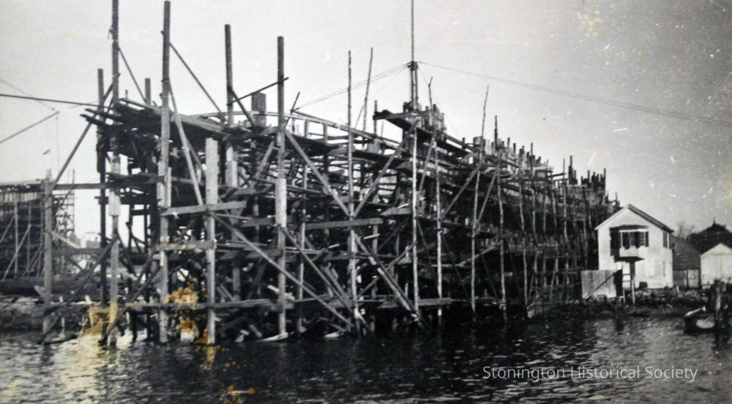 Exterior view of the SS Lansing as it was being rebuilt at Stonington between 1918 and 1919. This image shows the scaffolding surrounding the hull, and was taken from Stonington harbor. The Lansing steamship was rebuilt by the Ship Construction and Trading Company, Inc. of Stonington for the Nafra Company of New York.Made/Created