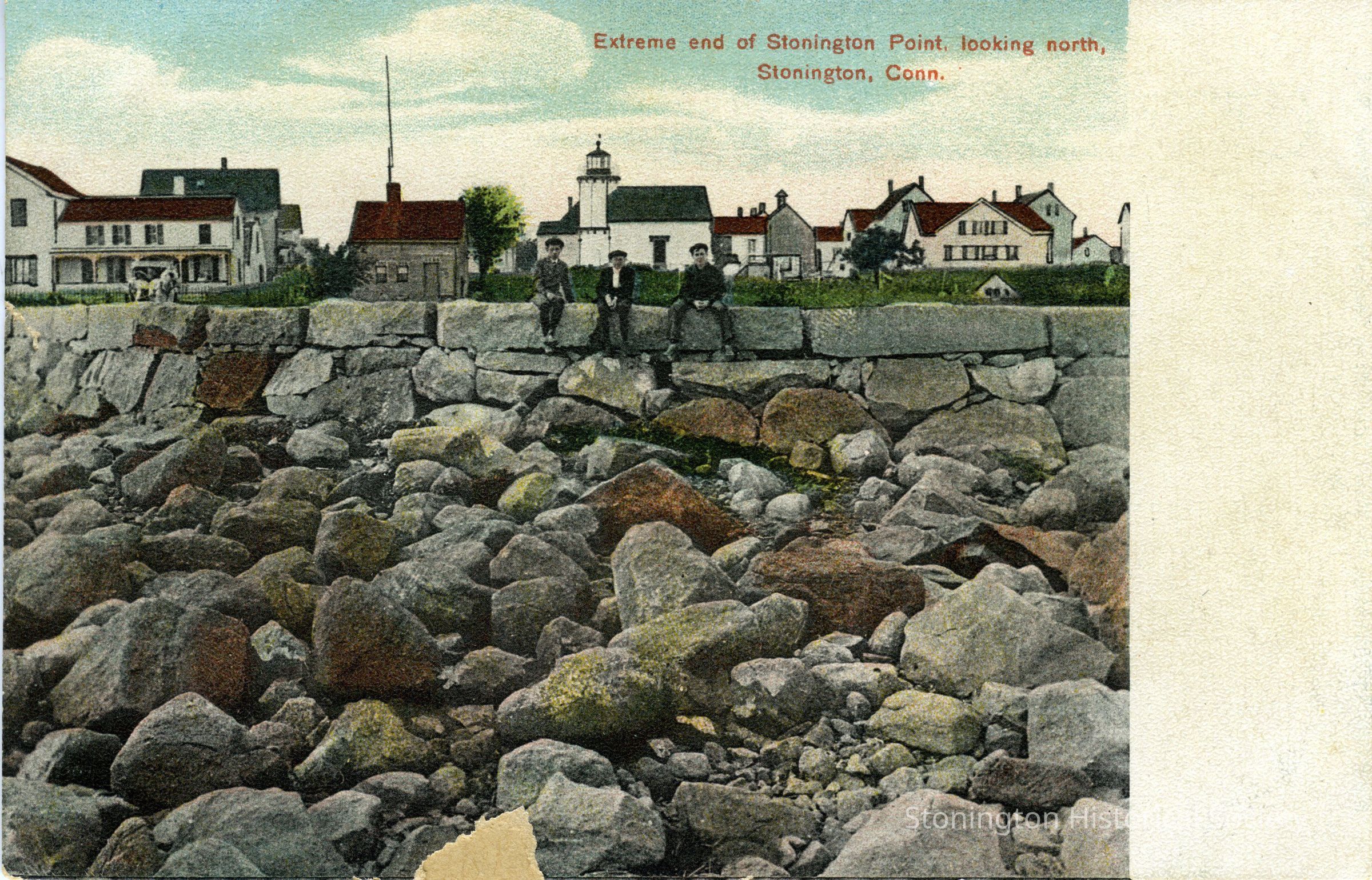 Looking north from Stonington Point with three boys sitting on stone wall. In another collection, this postcard is dated 1907