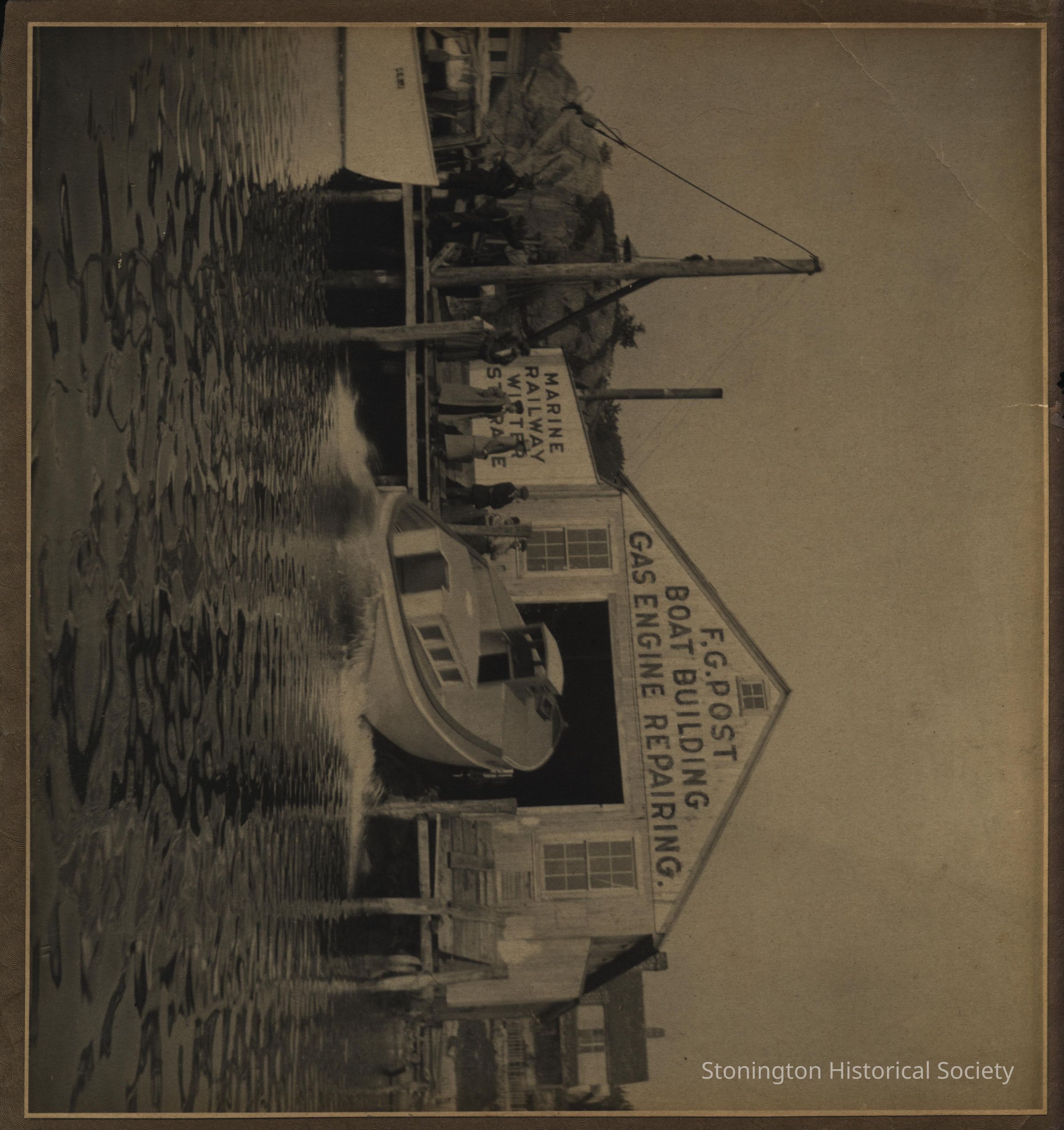 Photograph mounted on cardboard of F. G. Post Boat Buidling Ga Engine Repairing building in Mystic CT (now Seaport Marine) with boat being launchedCollection