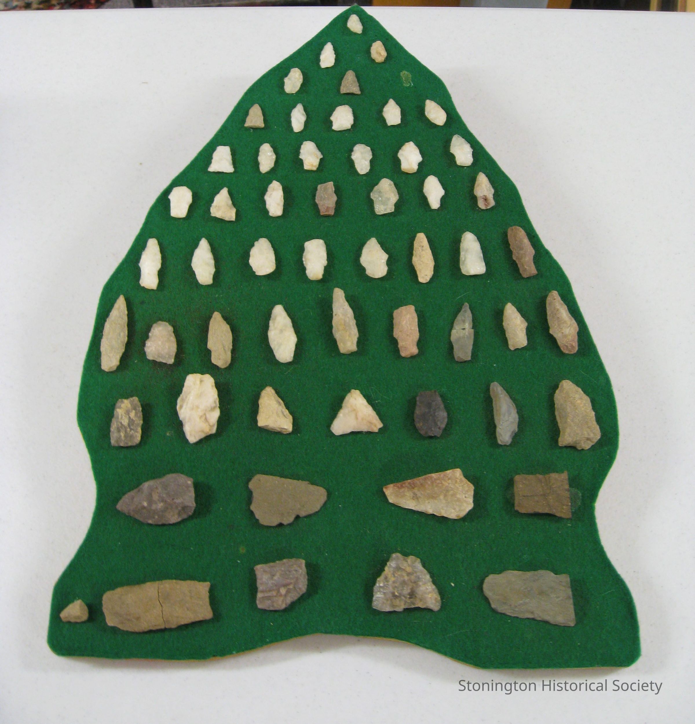 Felted board in shape of arrowhead with 50 arrowheads attached (one is missing from upper right hand corner). Various shapes, colors; small white probably quartz for bird hunting; larger ones used for bigger game.Collection