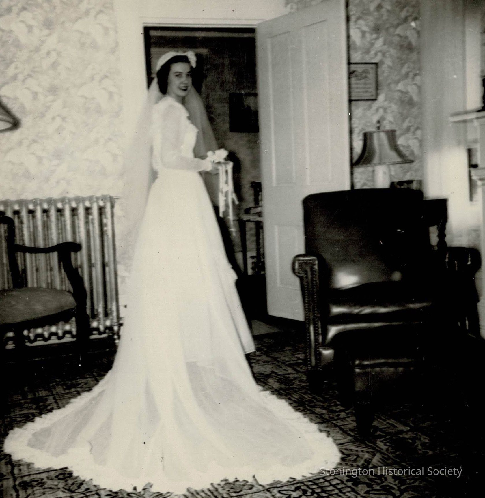 Black and white photograph of Eleanor Reilly (1928-2017), on her wedding day, June 3, 1950 in her parents home in Taunton, Massachusetts. Eleanor married Andrew Wheaton Perry (1927-2014), owner and proprietor of Stonington Lumber Company for many years.Collection