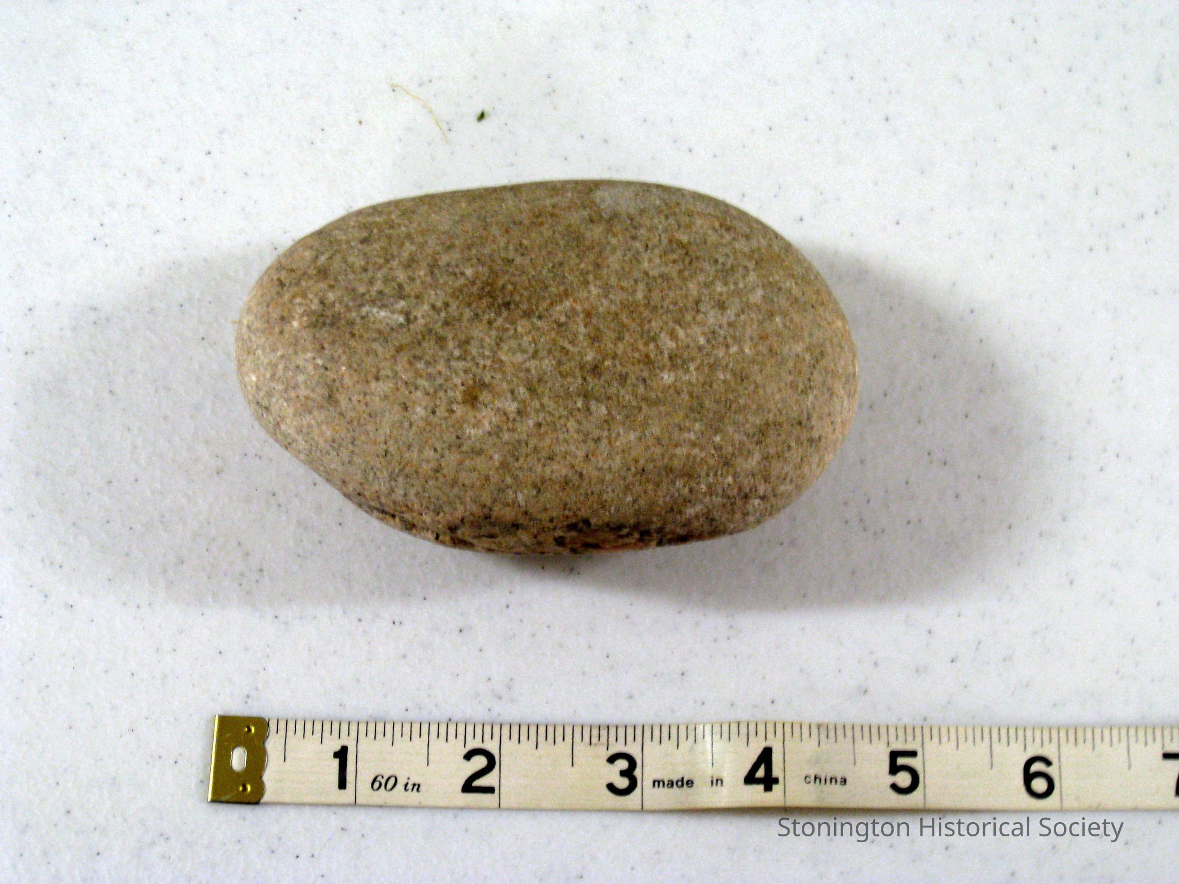 Stone used for crushing and smoothing. 5" long, 3 1/2" across, smooth on one side, rough on the other, grayish-pink graniteCollection