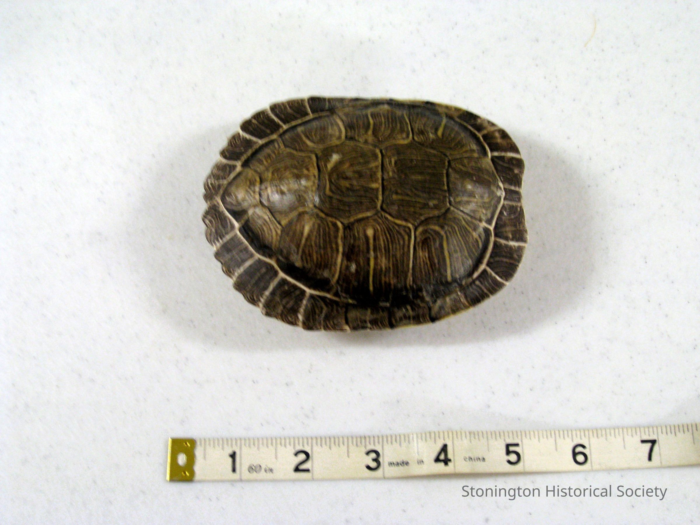 Example of turtle shell; roughly oval, 5 1/2" long, 9" circurmference; brown/tan; good markings; some skeletal (spine) inside); 26 segments around edge, 13 within; underneath horseshaped plate, 8 segments, "ivory" colored, each has black splotches