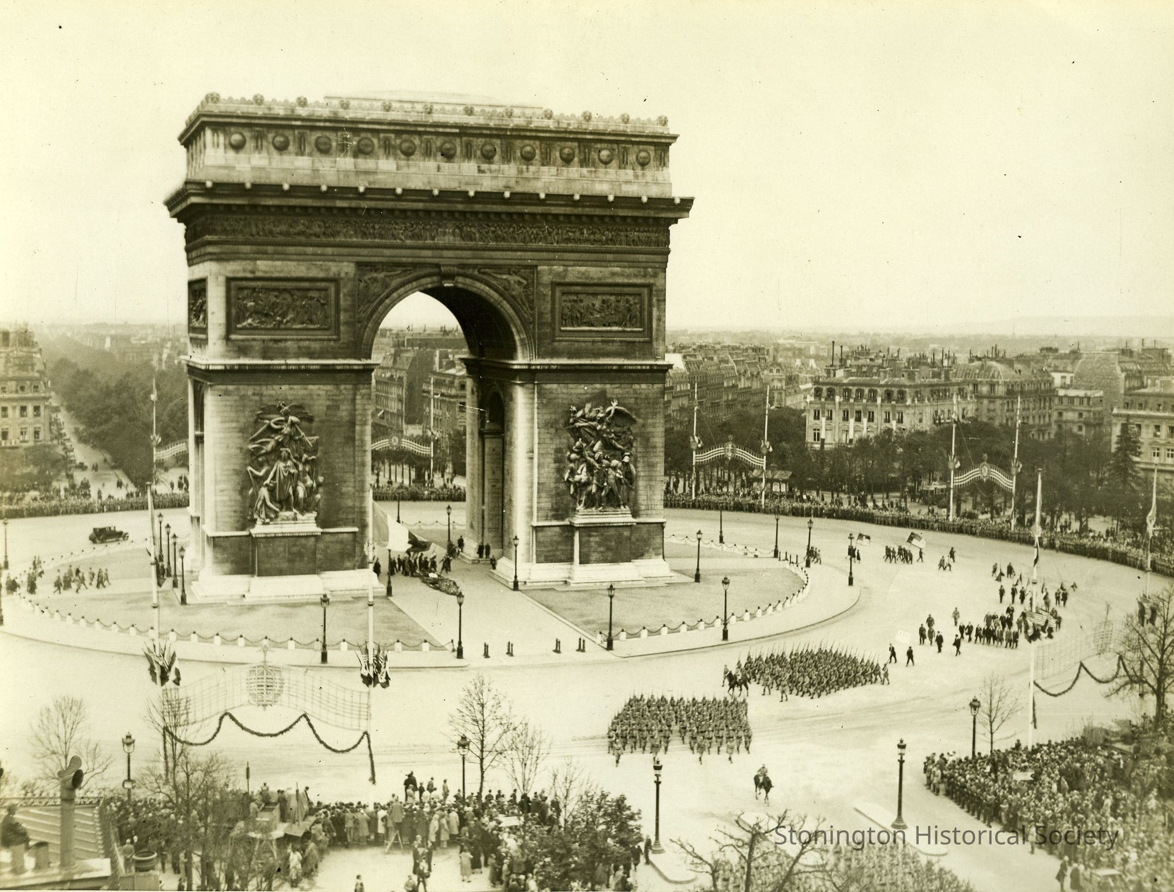 black and white photograph, celebrations at the Arc de Triomphe, with soldiers marching in military formation