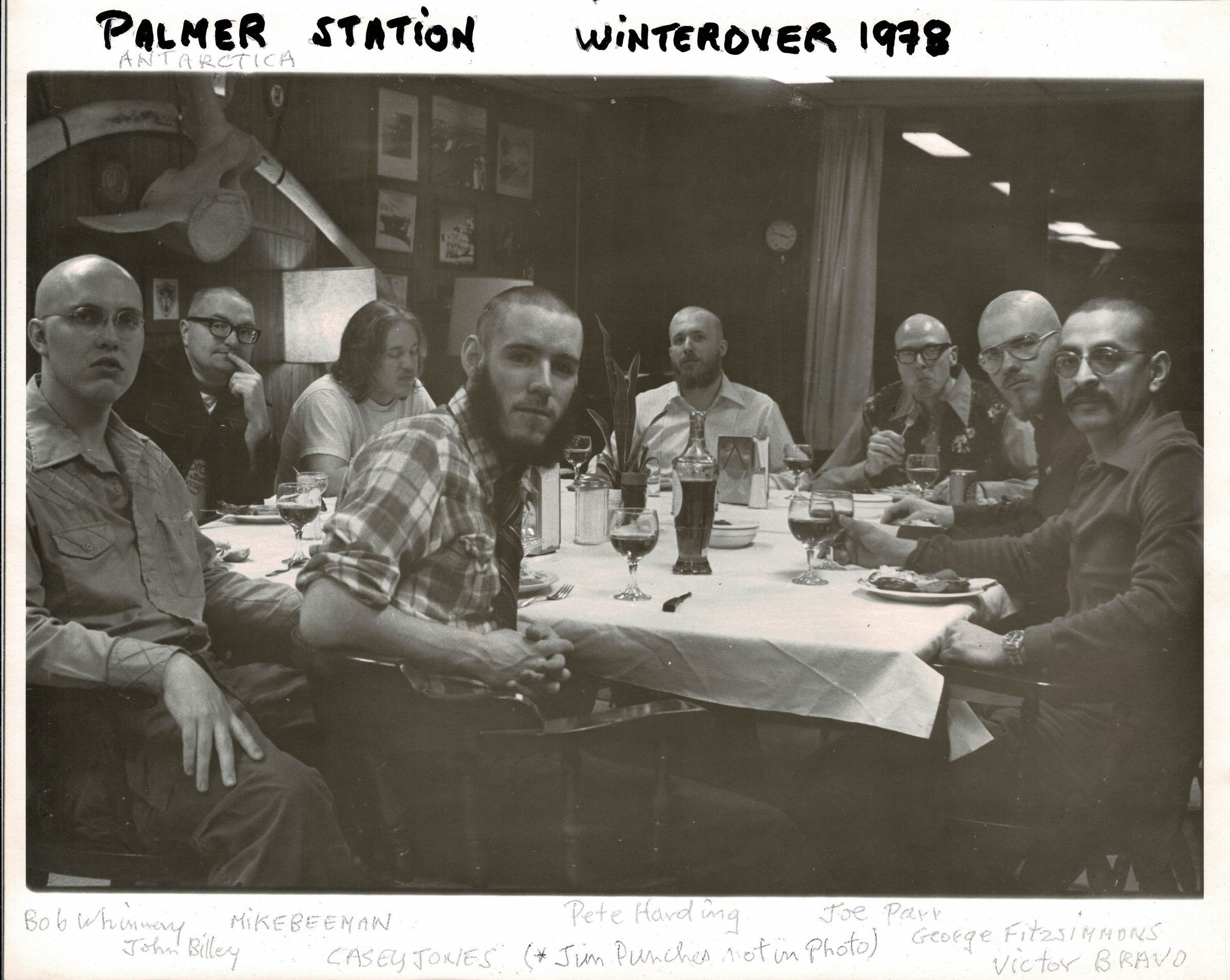A black and white photograph of a group of men who overwintered in Palmer Station, Antarctica in 1978/79. Names are written on the bottom. From left to right: John, Billey, Bob Whinnery, Mike Beeman, Casey Jones, Pete Harding, Joe Parr, George Fitzsimmons, Victor Bravo. Not pictured: Jim Punches.