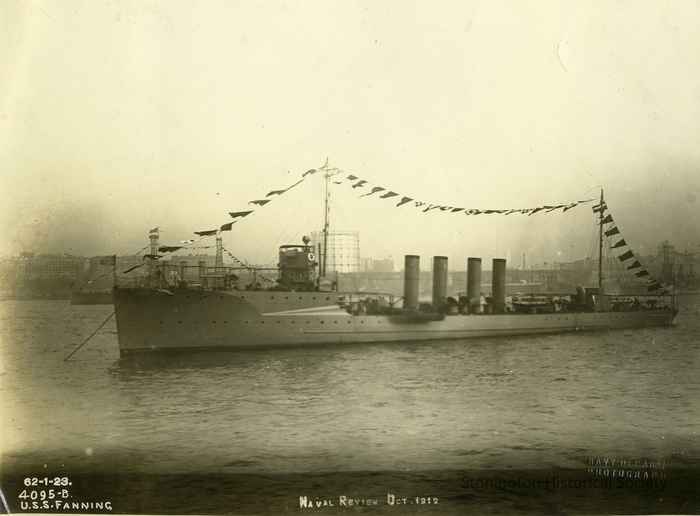 black and white photograph, U.S.S. FANNING , stamped "Naval Review October 1912, U.S. Navy Department Photograph" see 2016.048.006