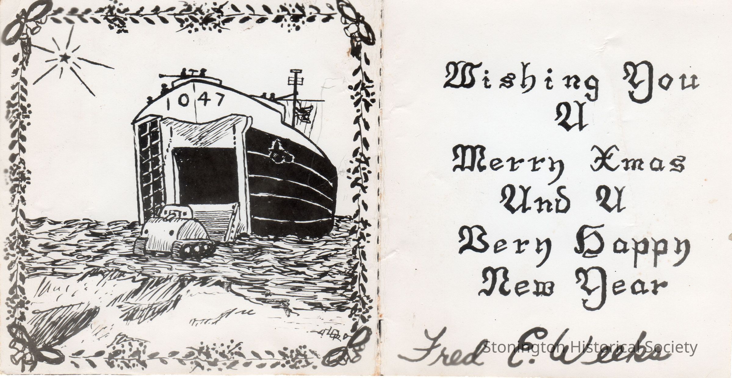 Christmas card printed on photo paper from Fred Eugene Weeks of Stonington. Fred served on a 1047 in the Pacific theater during WWII. He was born in Stonington on March 16, 1922, and lived in North Stonington when he was drafted in 1942.