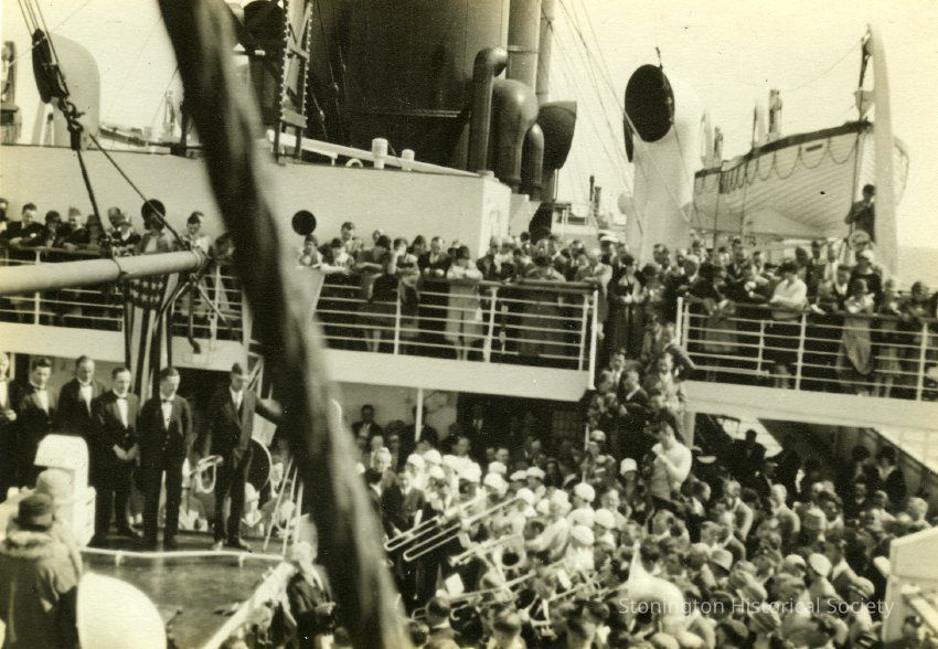 black and white photograph, celebration with band and civilians on deck unknown vessel