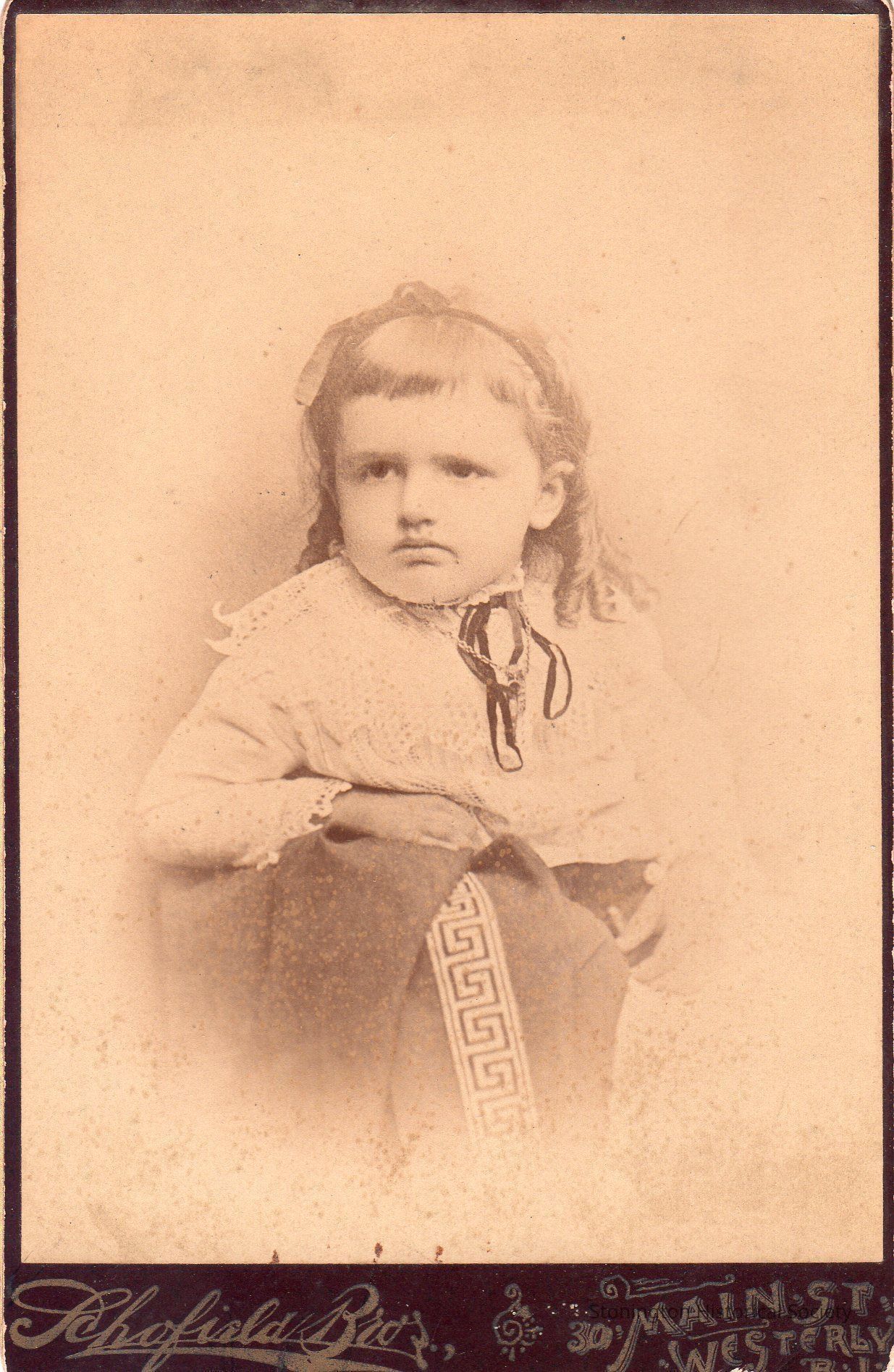 Photograph portrait identified as "Frankie Chesebro," taken by Schofield Bros, 30 Main Street, Westerly, RI. Probably Winnifred Frank "Frankie" Chesebro (1880-1887), the daughter William Franklin Chesebro and Emma Palmer Wilcox.