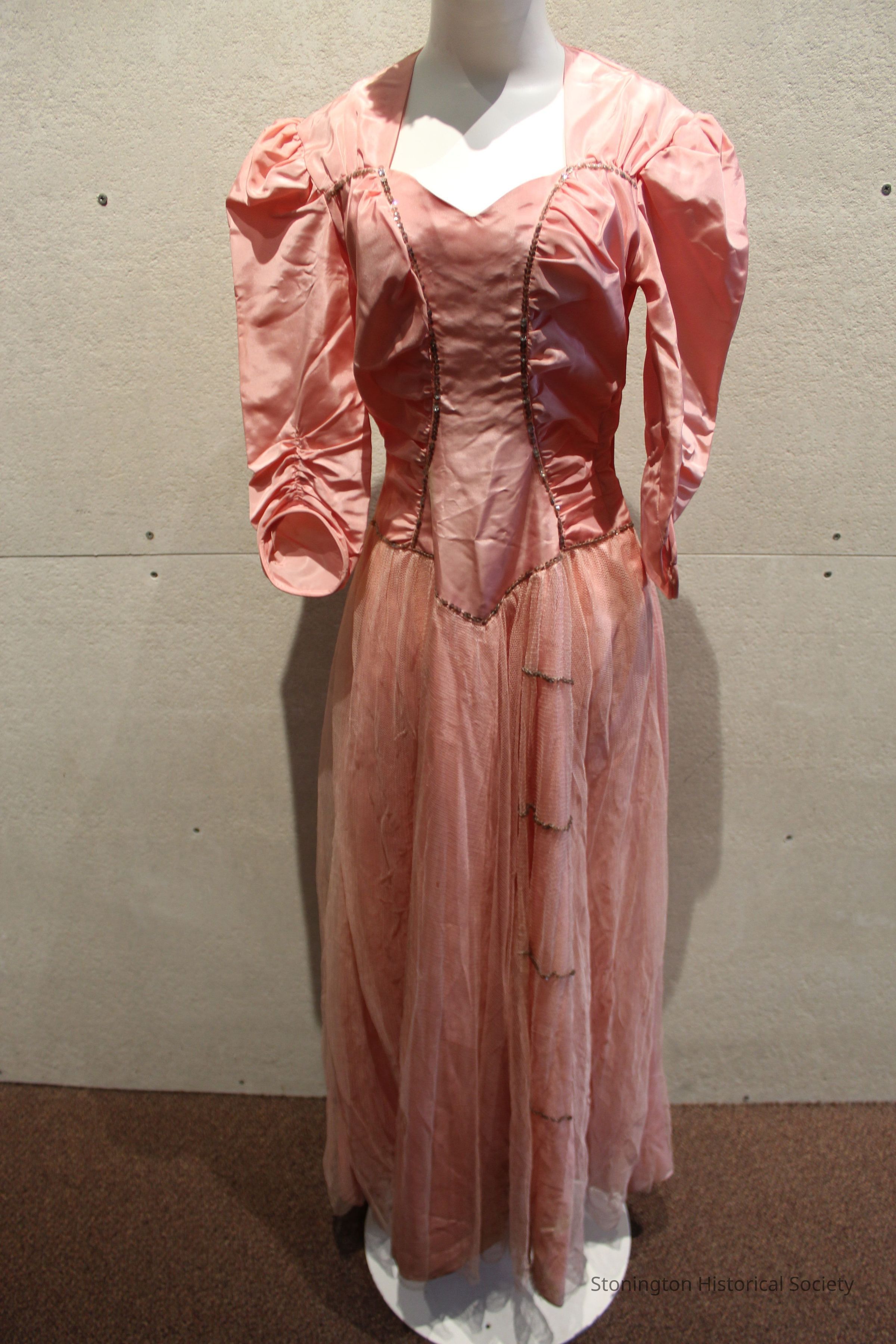 Pink taffeta bridesmaid dress with rose colored netting and sequin detail, made by Harlene Designs. Worn by Philomena M. DeSimone as maid of honor in her sister's wedding, on November 9, 1944.Collection