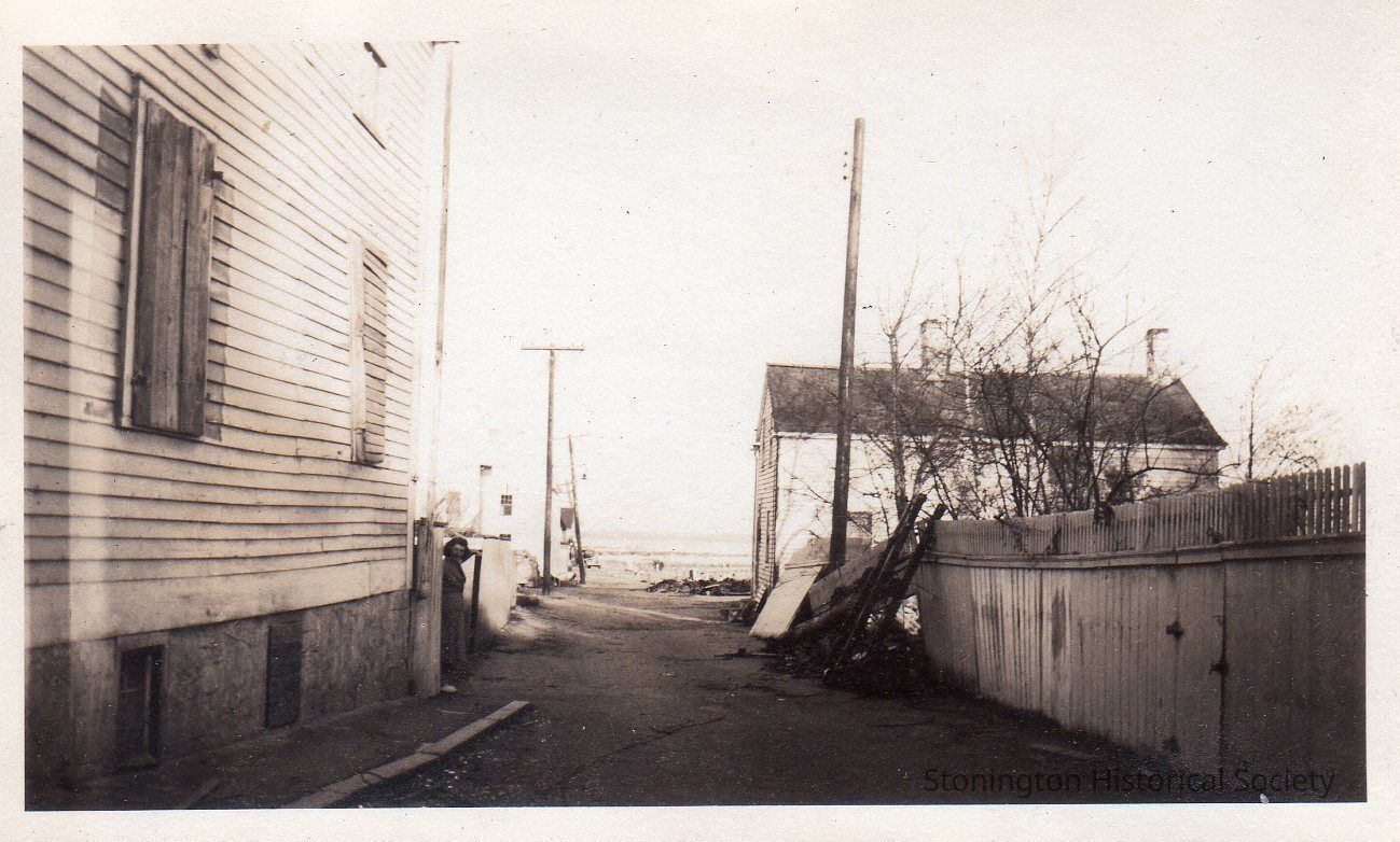 3 black and white photographs, view of damage from the 1938 Hurricane along Wall Street. From photograph album of Bertha D'Amico.