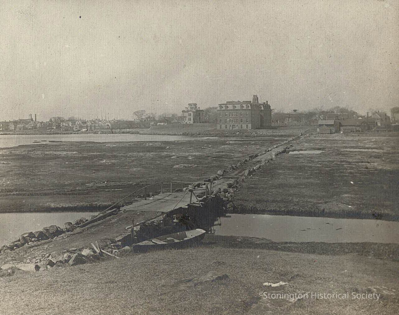 Photograph depicting the plank bridge, now referred to as the causeway, that leads from Stonington Borough to Salt Acres. The reverse side reads : "Plank Road to Chesebro House". This is in reference to Erastus Chesebro, who went to California during the Gold Rush and returned with enough money to build a spacious mansion in 1869. This view is taken from Salt Acres, looking back toward the Borough School, and the Samuel D. Denison home, later home of Eugene Atwood at the end of Church Street.Collection