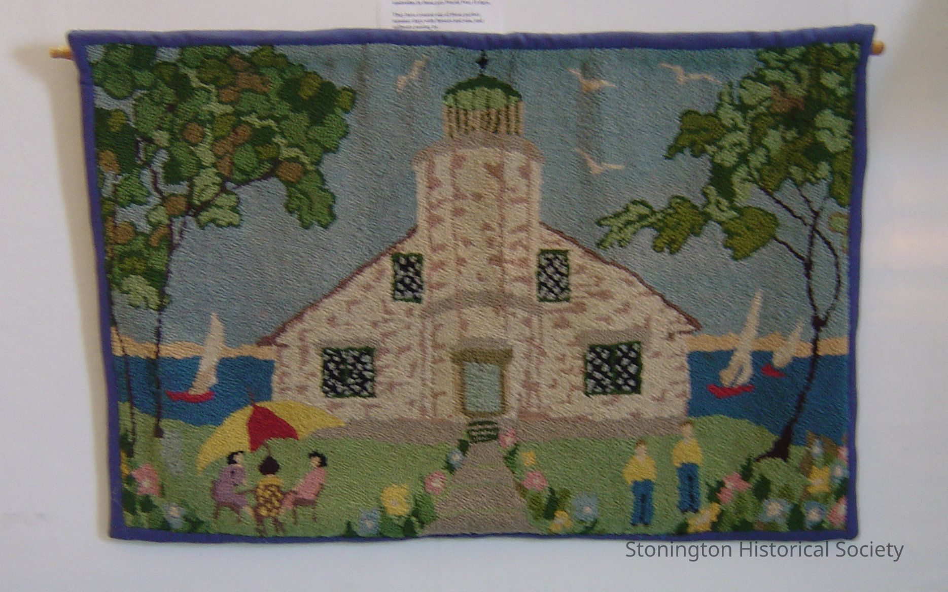 Hooked Rug hanging, woven by women living in an "old ladies home" in the 1930s. The scene depicts the lighthouse on a sunny day, with visitors drinking tea under umbrella's on the grounds (the lighthouse served tea outside during these days)The rug was made in a Tuberculosis sanatorium near Mt Kisco, NY. A woman from Westerly named Grace Brindle designed and supervised making the rug by the patients. Grace was an occupational therapist at the facility. The two figures with yellow sweaters down in the lower right quadrant are Lorenzo and Billings Fairbrother, twins. [This last bit given by Prudence Fairbrother Meehan, 2024]Collection