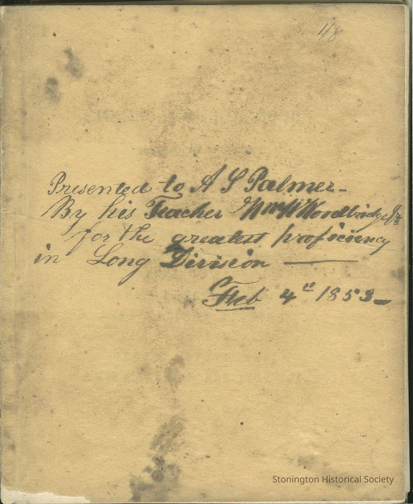 Inside front cover: "Presented to A. S. Palmer by his teacher, _____________, for the greatest proficiency in Long Division, Feb. 4th 1853"