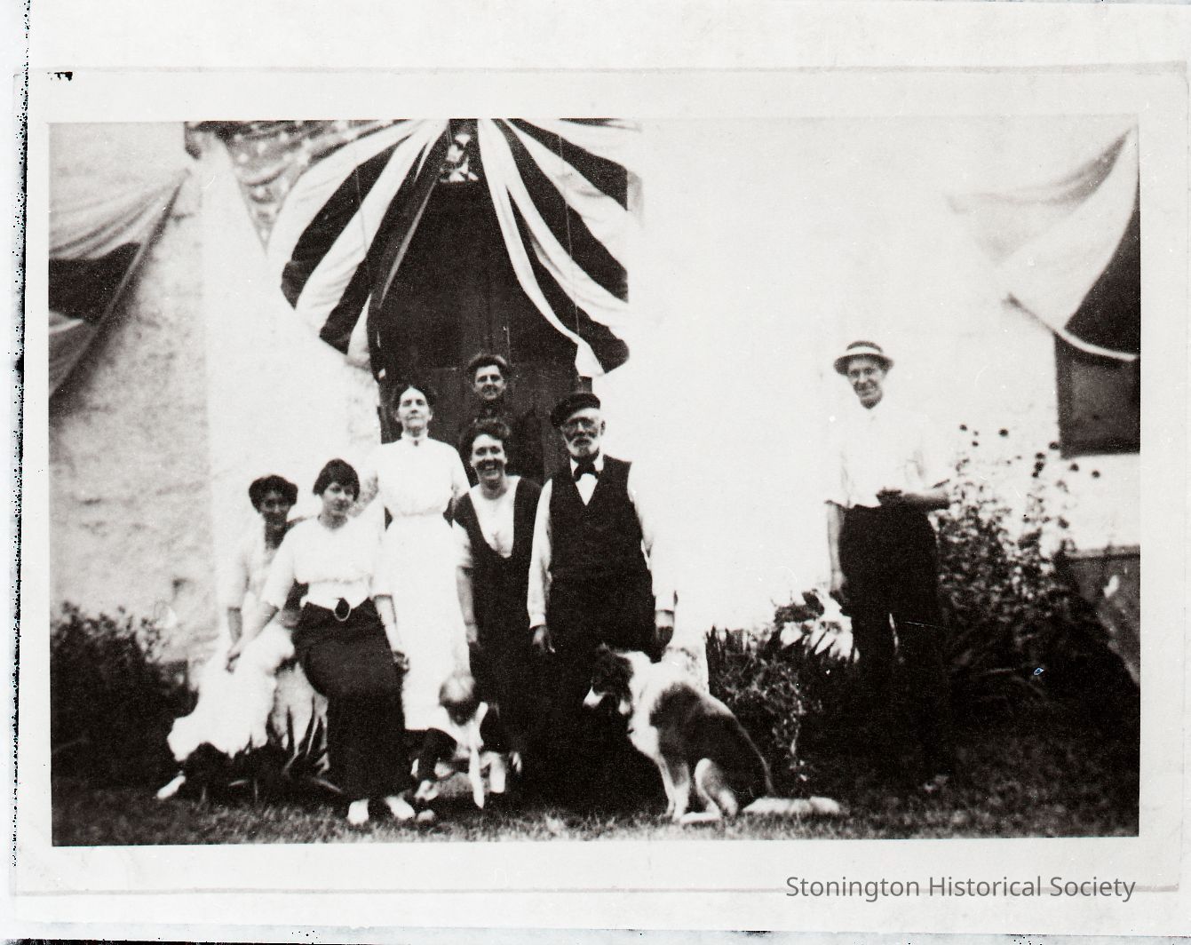 Photo taken of family outside lighthouse decorated with bunting. Negative was found at the Lighthouse and printed inhouse