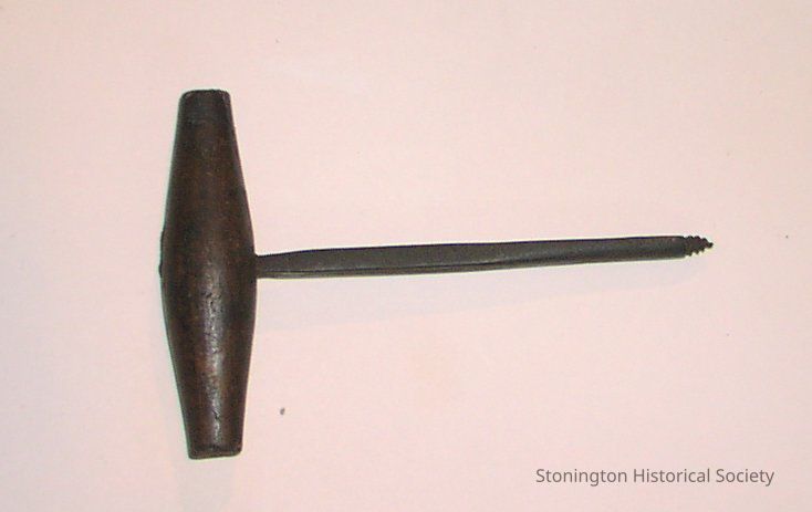 Auger, (probably a shell or taper auger) with a wooden handle.
