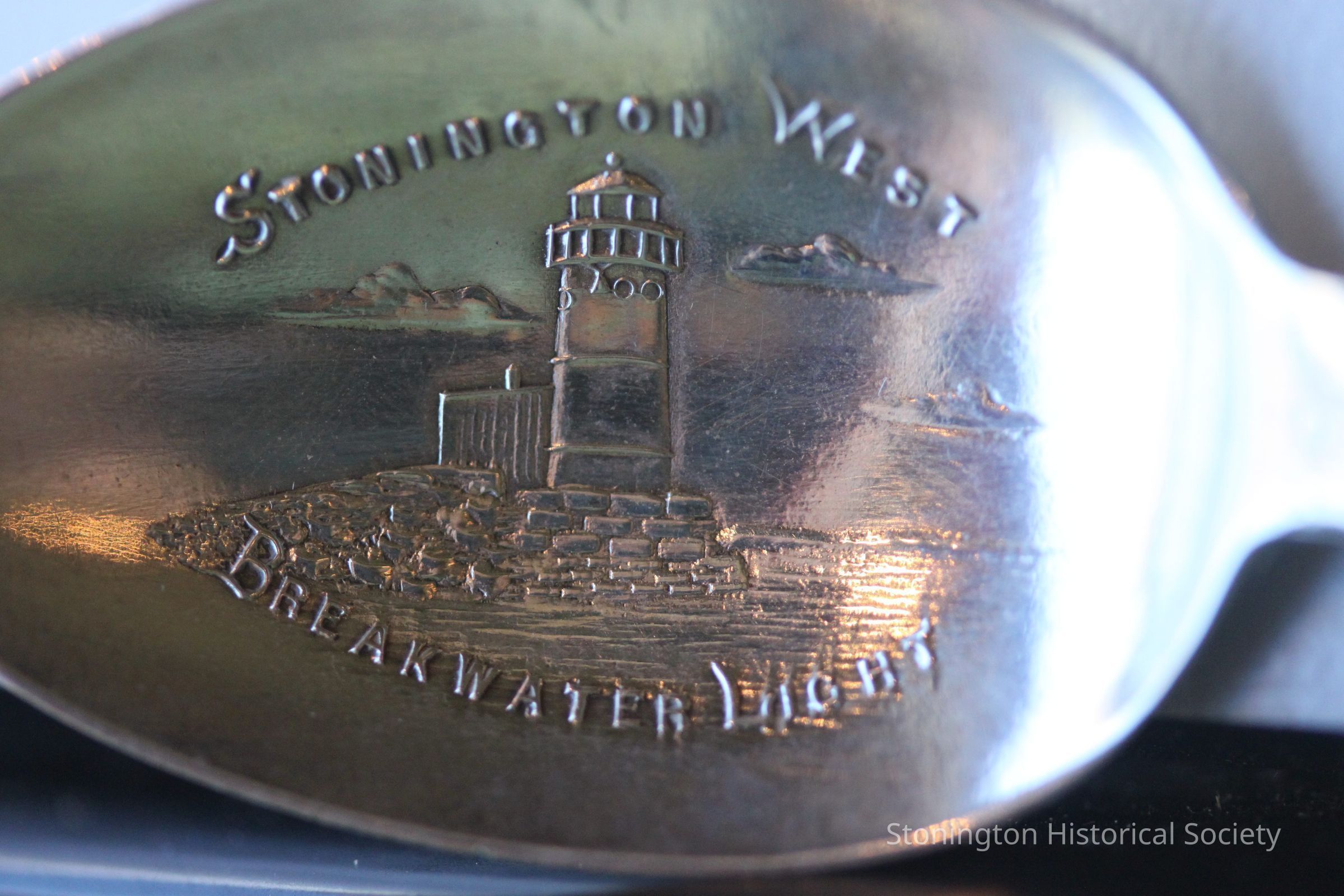 Spoon featuring the Stonington West Breakwater Light. The handle is fashioned after a Native American wearing a loincloth and headdress and wielding a tomahawk. The back of the handle features a number of objects associated with Native Americans, including feathers, a pipe, a club and a shield.