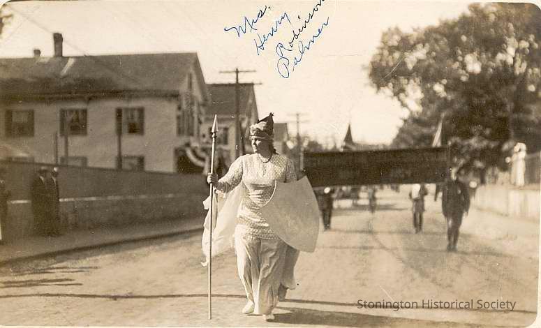 "Stonington" marching in parade for Battle of Stonington Celebration, 1914. Labeled Mrs. Henry Robinson Palmer on front of card and note on back gives her real name: Rieta Babcock Palmer