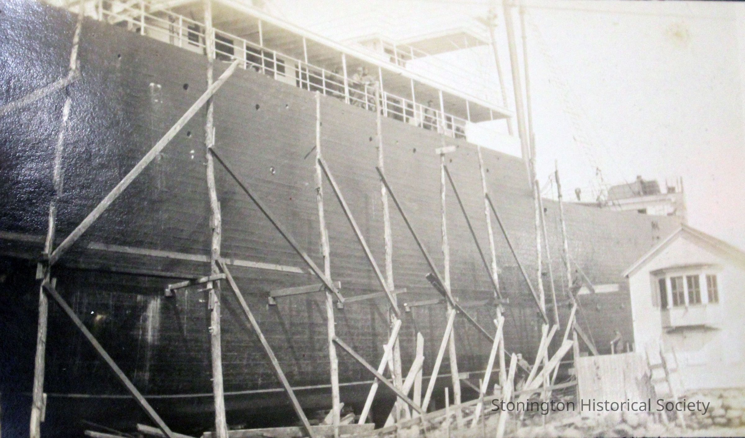 A side view of the SS Lansing as it nears completion in the spring of 1919. The hull is nearly finished, and most of the exterior scaffolding has been removed. The Lansing steamship was rebuilt by the Ship Construction and Trading Company, Inc. of Stonington for the Nafra Company of New York.Made/Created