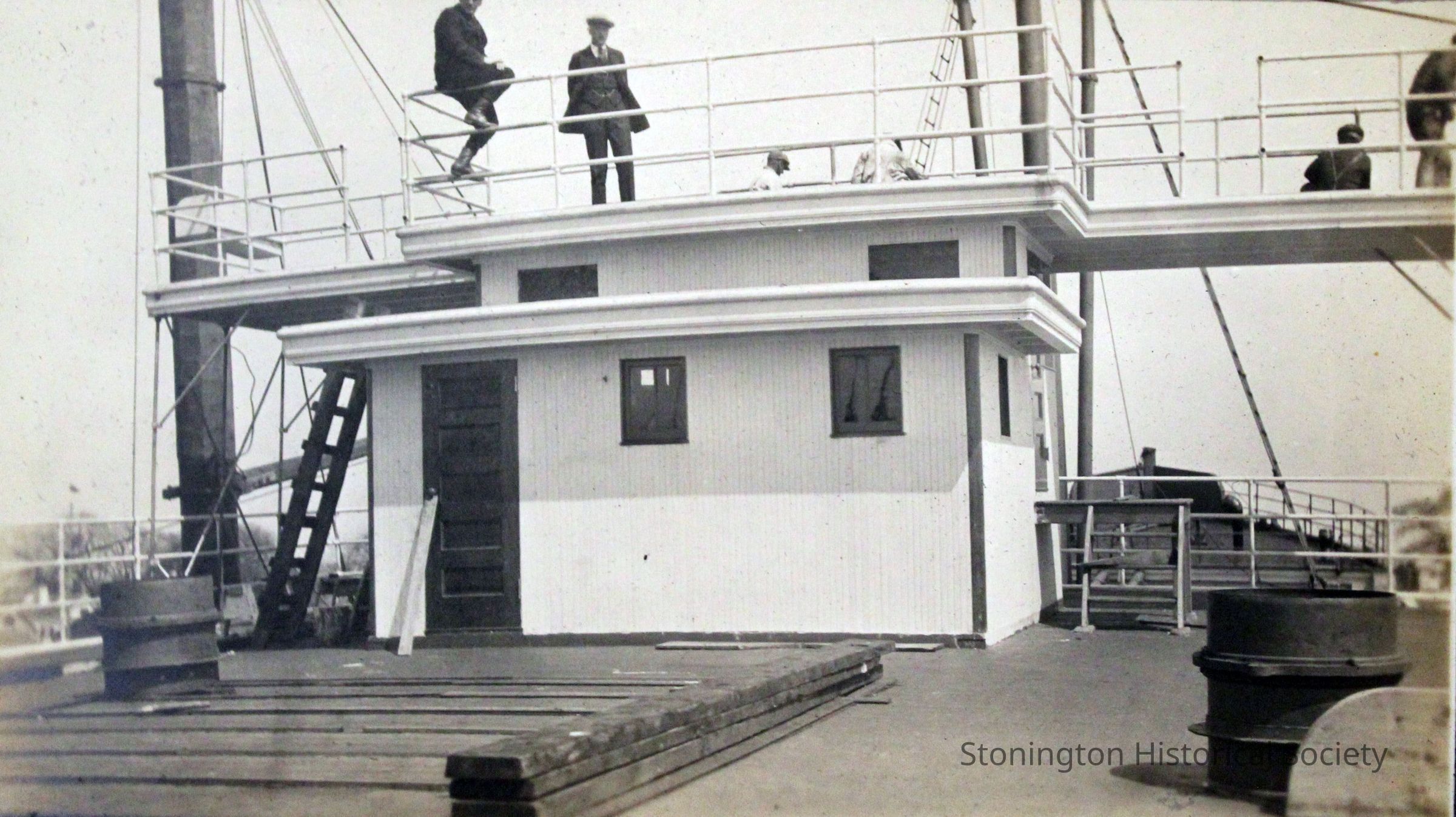 Workers putting the finishing touches on the SS Lansing before its launch in May of 1919. A few men in suits can be seen on top of the pilot house, with a few workers at center and right. The Lansing steamship was rebuilt by the Ship Construction and Trading Company, Inc. of Stonington for the Nafra Company of New York.Made/Created