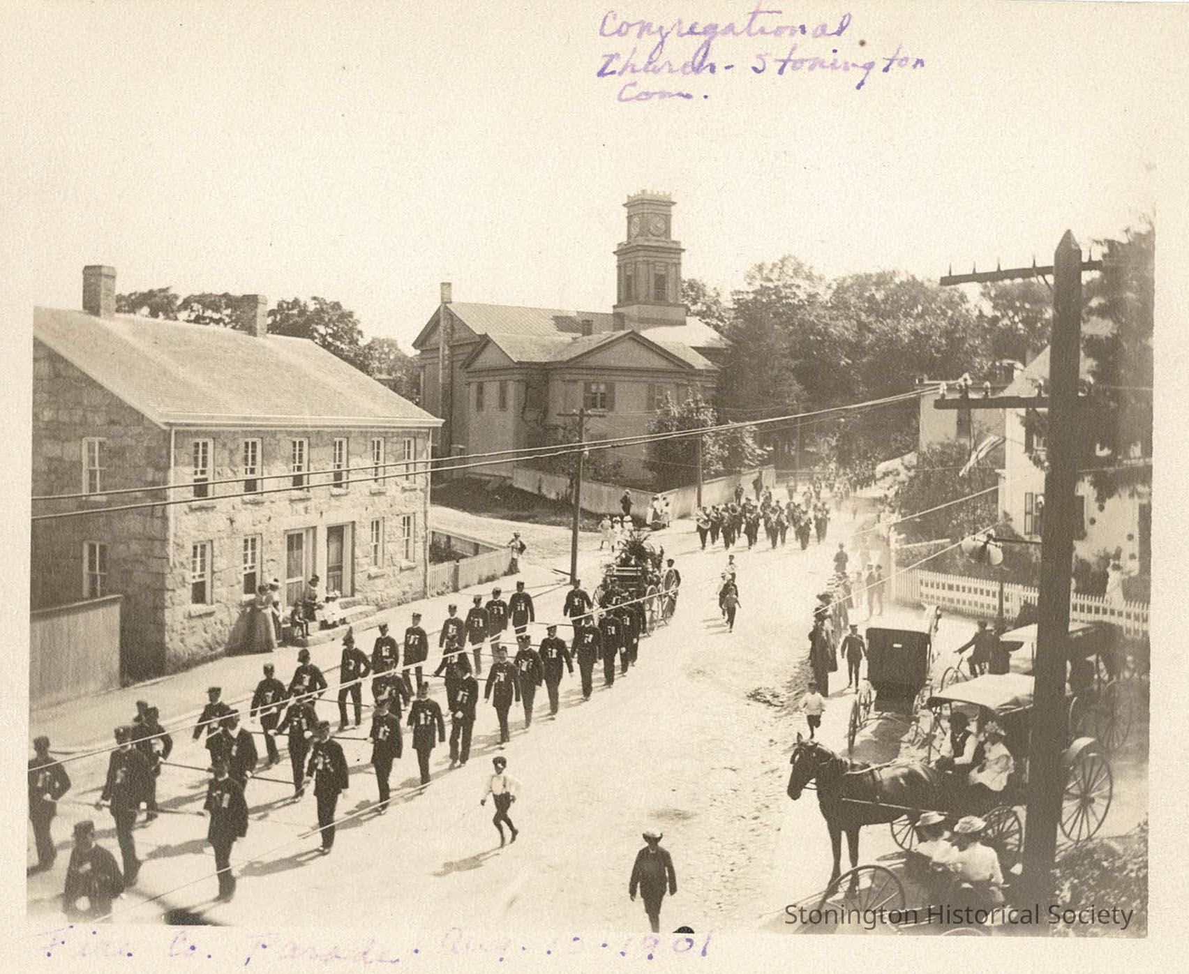 Congregational Church with clock tower is noted on the image. Shows the Stonington Fire Company marching in a parade down Elm Street.Collection
