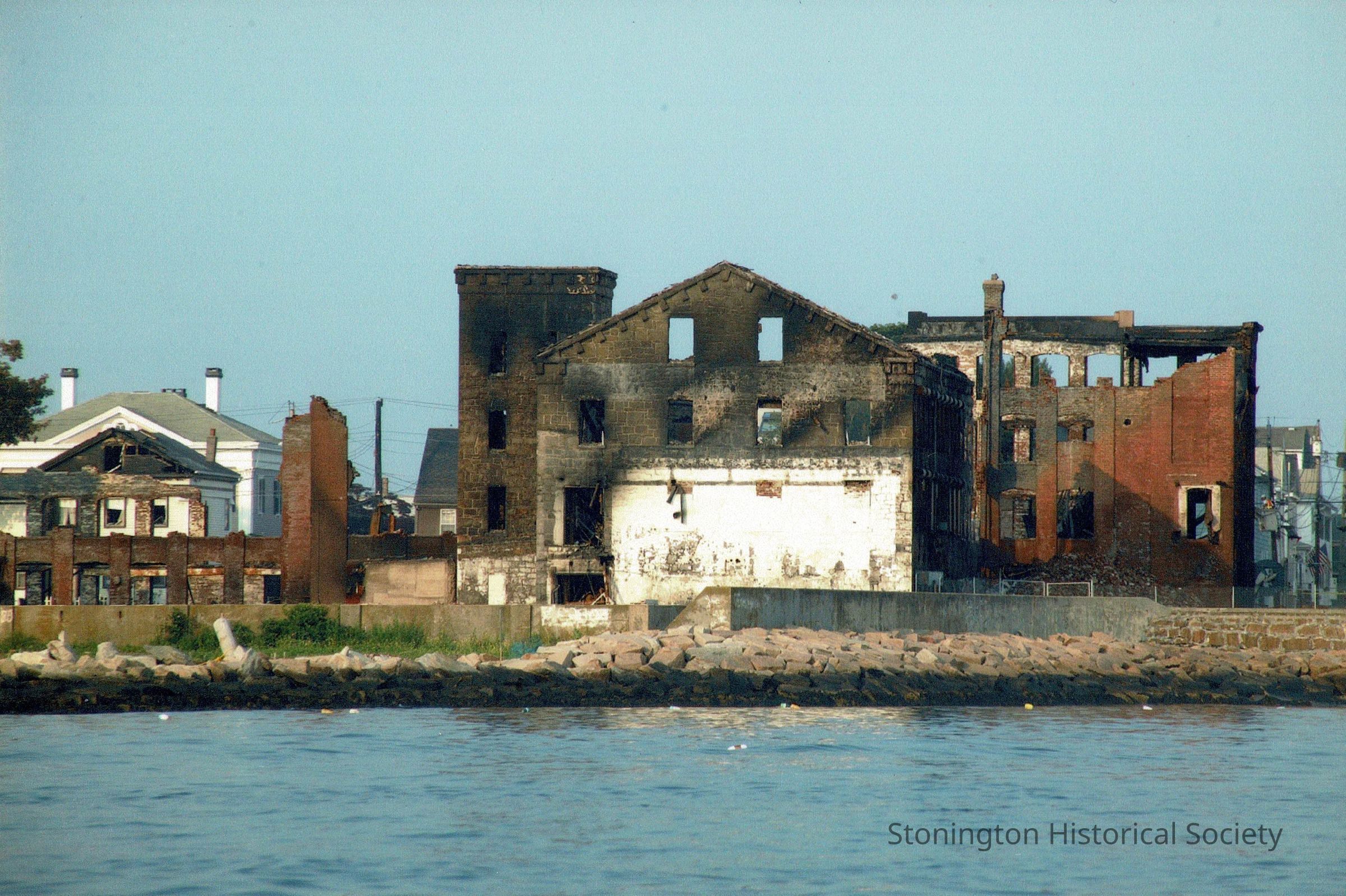 Photograph taken after the Atwood/Monsanto fire of July 3, 2003, from Stonington Harbor. Contractors were working to renovate the old factory into luxury condominiums - Stonington Commons. This photograph shows the damage from the fire, a few days after.Collection