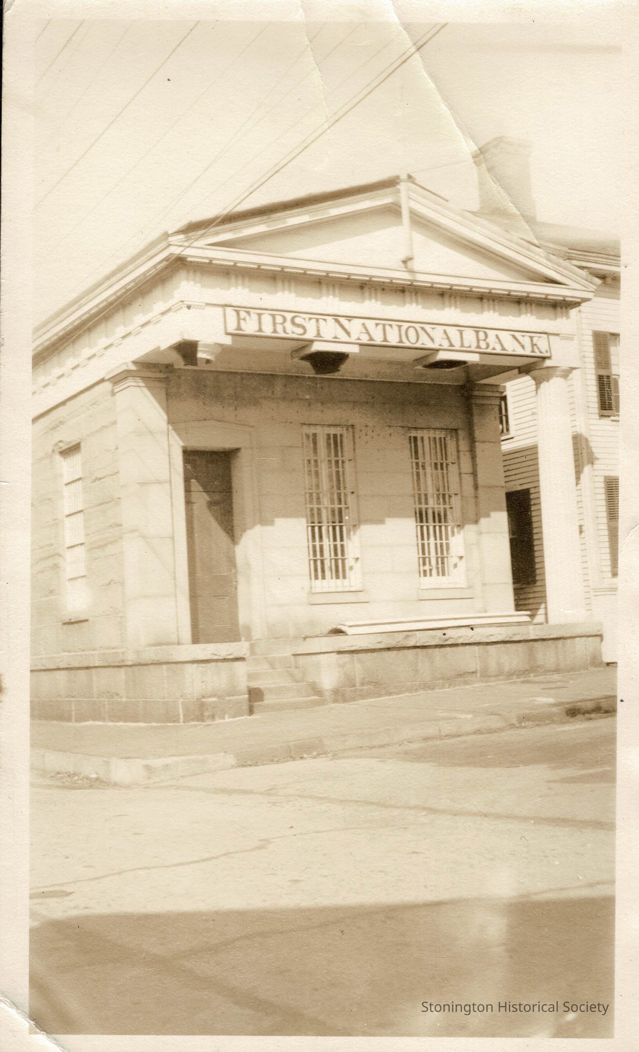 A photograph of the First National Bank of Stonington, most likely taken around 1940, when it was in voluntary liquidation.Collection