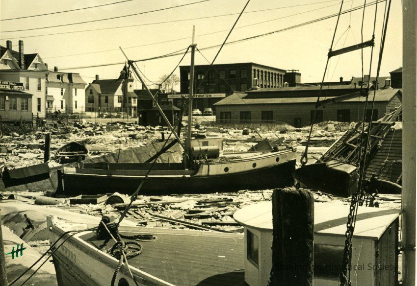 Fishing boats washed up north of Plax Corporation (formerly Atwoods) with debris in parking lot and Sea View Grill, Cocktail Lobster, on left with houses in backgroundCollection