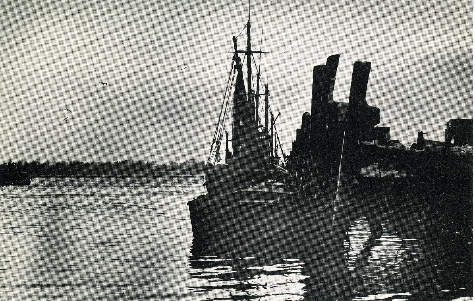 Fishing boats tied up at dock in Stonington Harbor B/W photo Former accession no. 1996.001.0112
