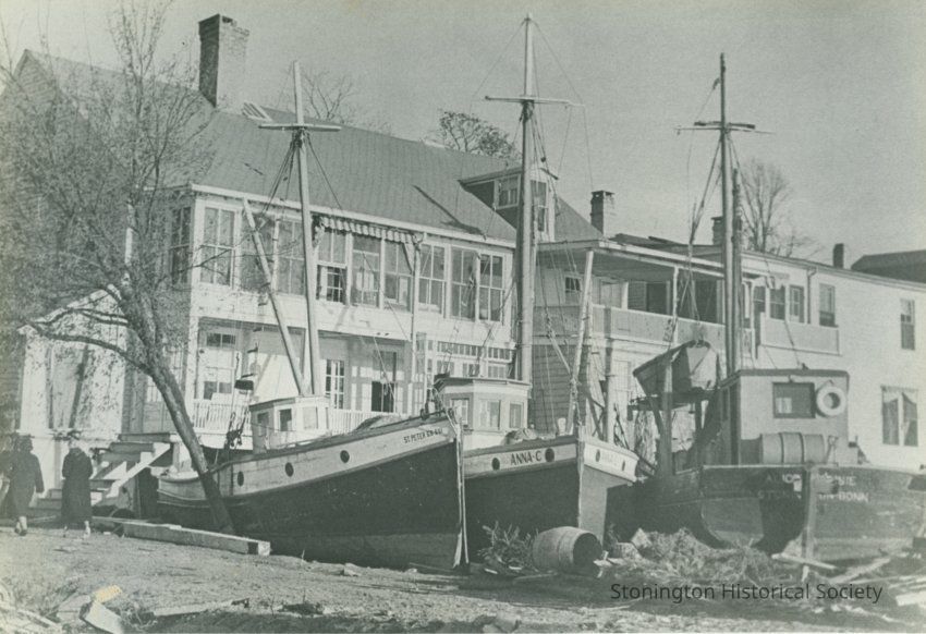 Fishing boats washed ashore behind Davis' Funeral Parlor on Water Street