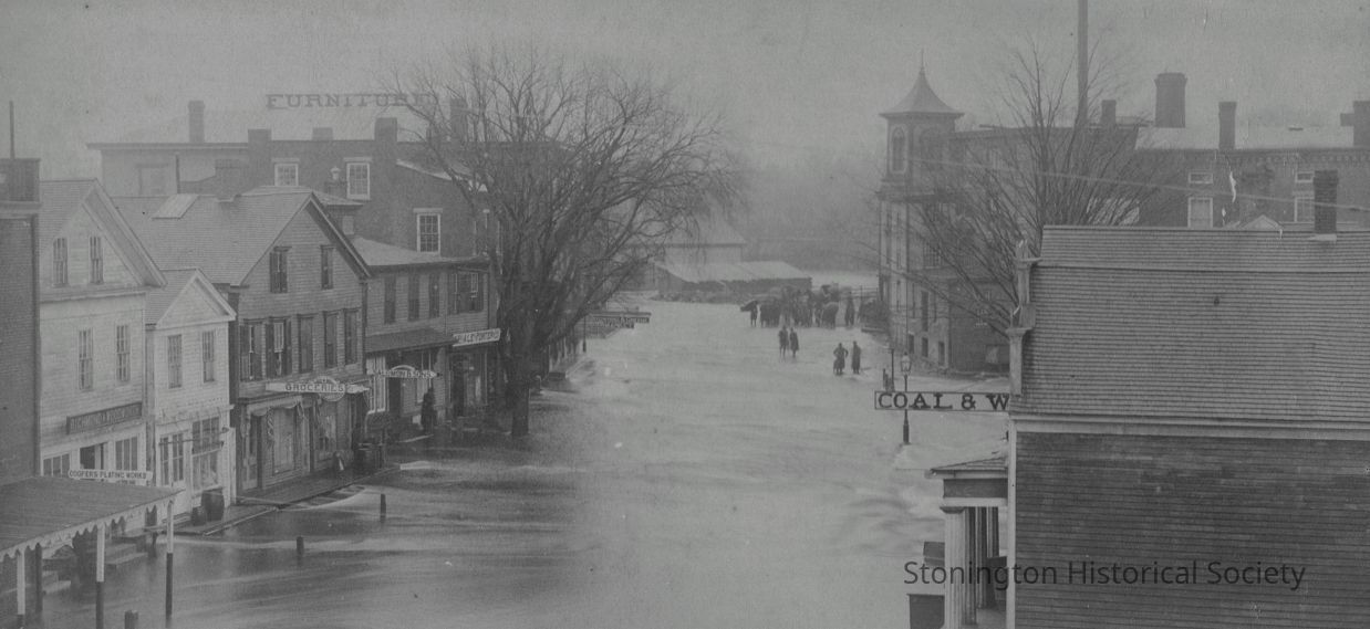 A similar view of 2025.223.4 but with water still in the road. Photograph shows West Broad Street in Pawcatuck, looking east, during the great flood in February 1886.Made/Created