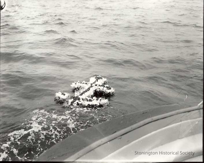 Floral anchor memorial floating away from boat during Blessing of the Fleet