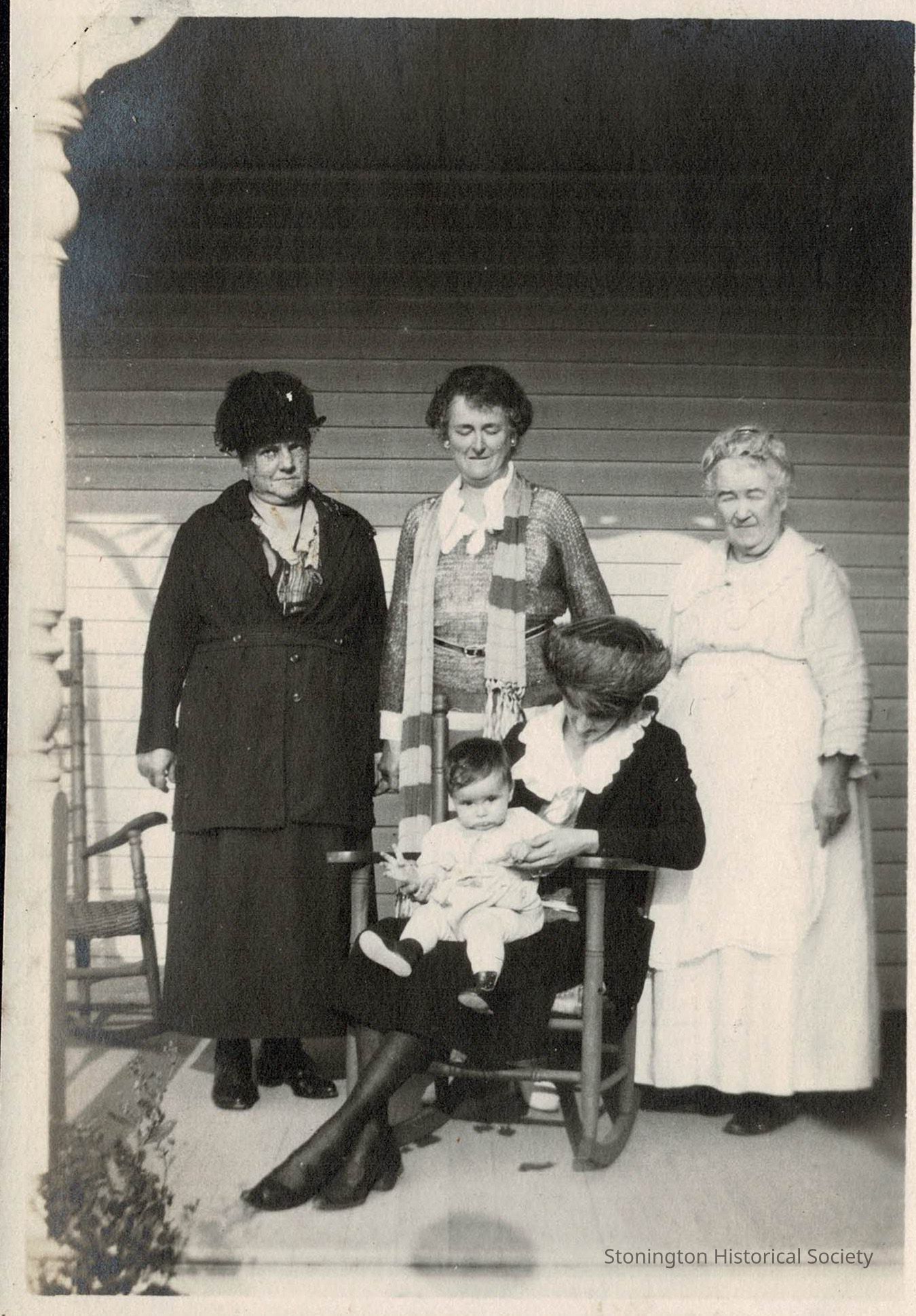 Four generations of women in the Perry/Lanphear family. Seated at center is Mildred Louise Lanphear Perry (1896-1985), holding her daughter Martha Elizabeth Perry (1921-1996). Standing behind them, left to right, are: Ella Louise Park Perry (1867-1957), Mildred's mother in law; Martha Elizabeth Clark Lanphear (1869-1945), Mildred's mother; and Catherine Edwards Lanphear, Mildred's paternal grandmother.Collection