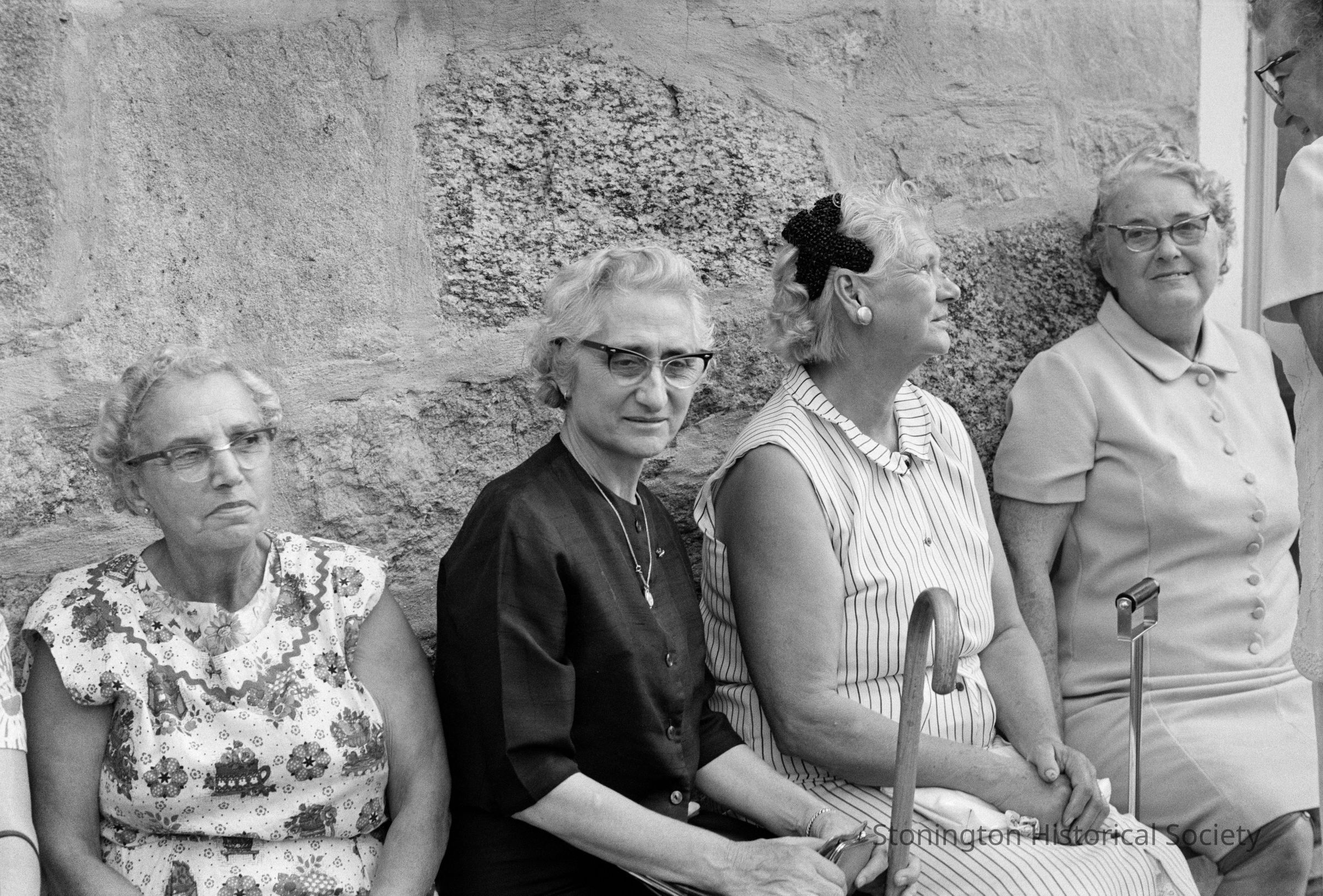 This image shows four older women seated in front of a stone wall, most likely at the Portuguese Holy Ghost Society. The women have been identified as Anna Pinheiro Burdick, Bridgette Travers, Anna Travers, and Della Grieser.Collection