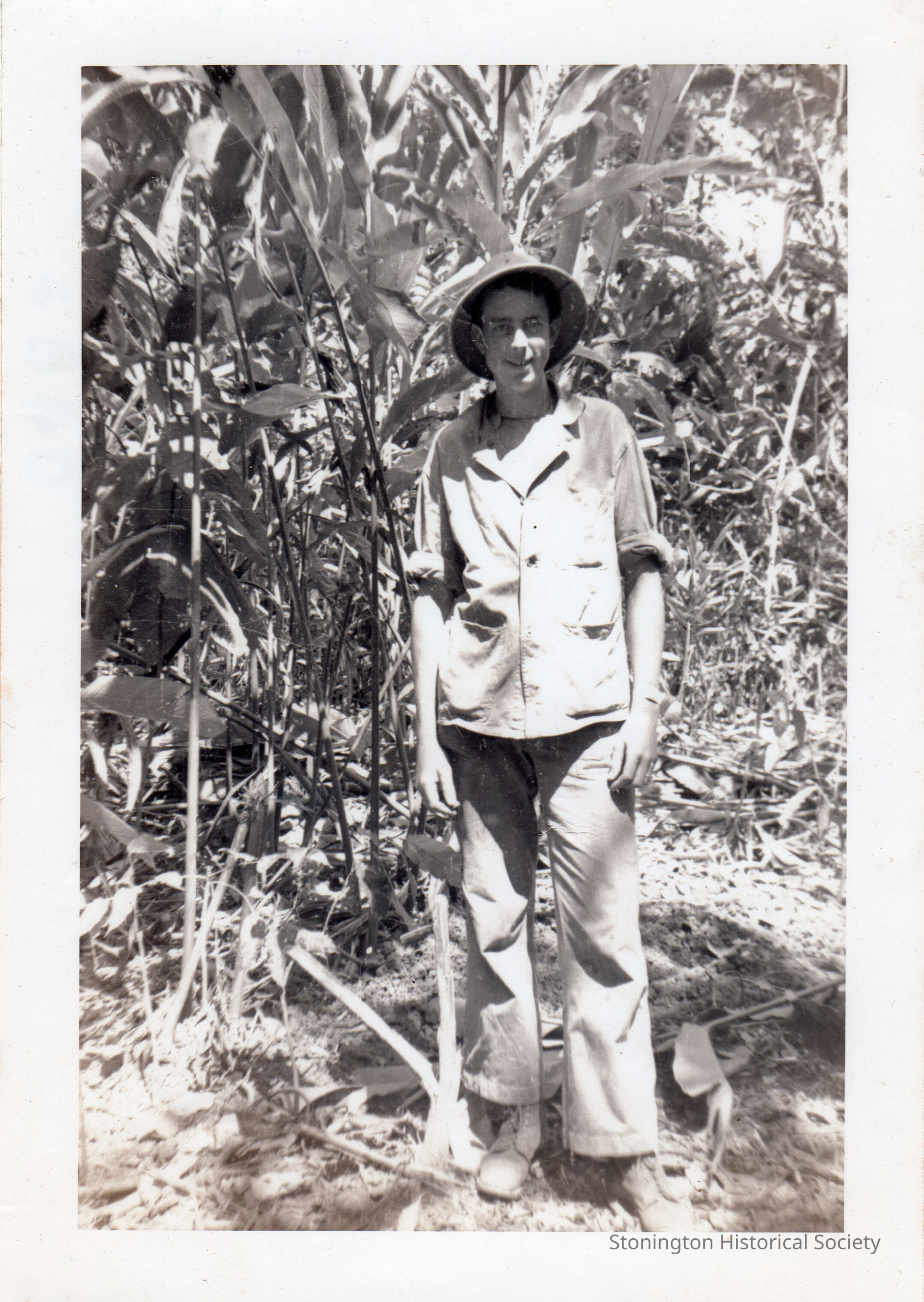 black and white snapshot of unidentified soldier in uniform (possibly in Guam), stamped on back: Fountain Photo Services, October 7, 1943. Weeks was born in Stonington on March 16, 1922 and served in the Pacific theater with the U.S. Navy.