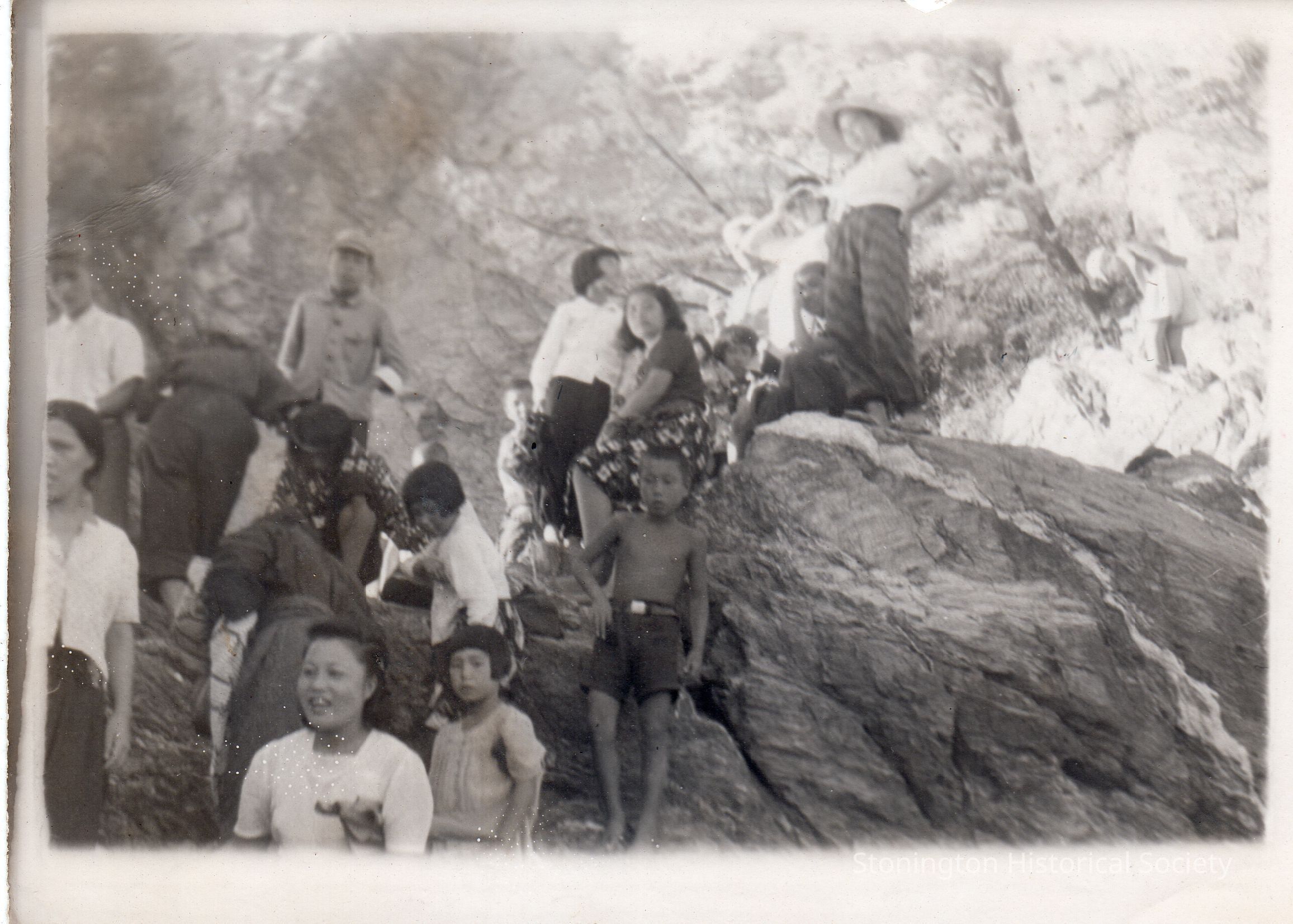 Black and white snapshot from the photograph collection of Frederick Eugene Weeks. Handwritten on back: "These Japs were lined up on the beach, watching the boats come in." Weeks was born in Stonington on March 16, 1922 and served with the U.S. Navy in the Pacific Theater during WWII.