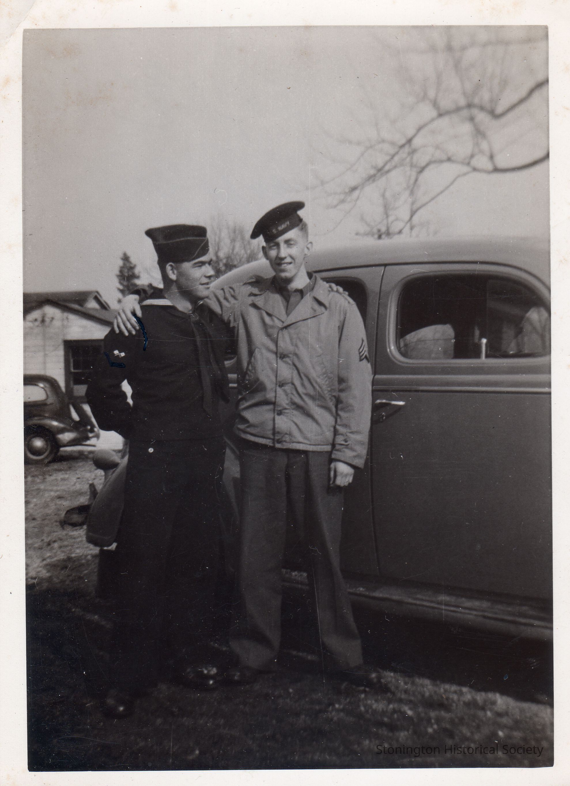Photograph of Fred Weeks and Thomas York in uniform. Handwritten on back: "Fred E. Weeks, S 2/c, Cadet Thomas G. York, March 3/45, dodge car, To Fred E. Weeks, S 2/c" (S 2/c - Seaman 2nd Class). Weeks was born in Stonington on March 16, 1922 and served with the U.S. Navy in the Pacific theater during WWII.