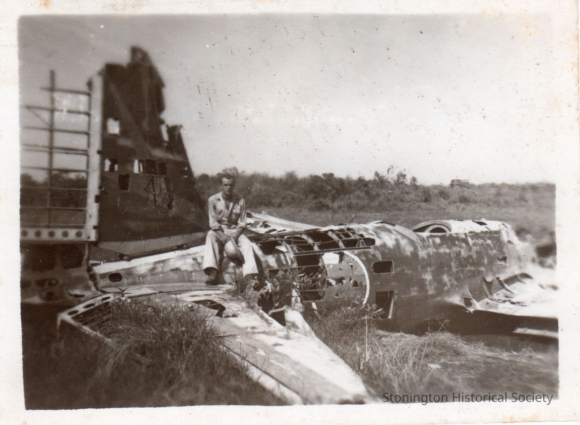 Black and white snapshot from the photograph collection of Frederick Eugene Weeks. Handwritten on back: "A Jap Bomber shot down." Weeks was born in Stonington on March 16, 1922 and served with the U.S. Navy in the Pacific Theater during WWII.