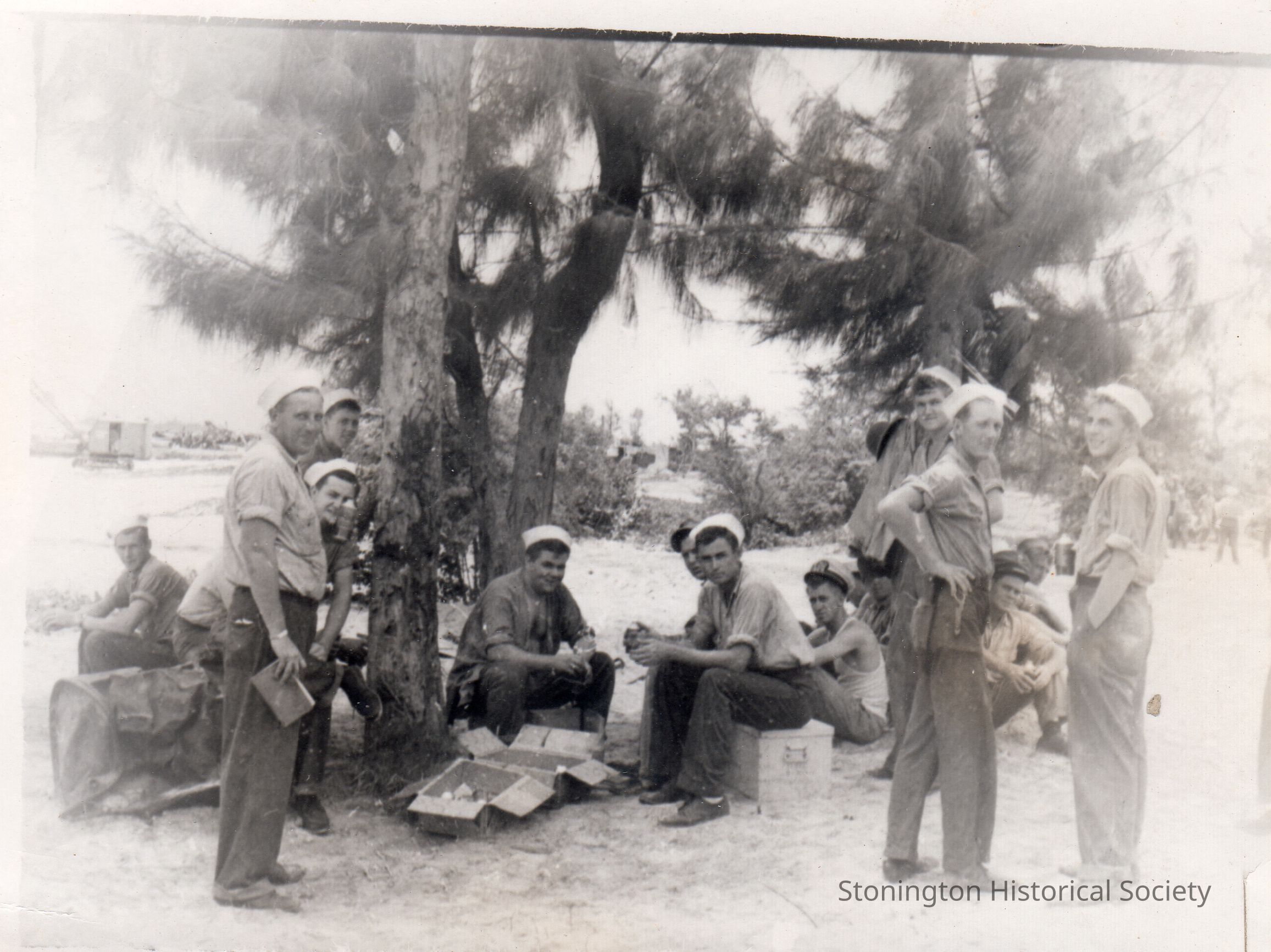 Black and white snapshot from the photograph collection of Frederick Eugene Weeks. Handwritten on back: "Scene From a Beer Party We Had Ashore!" Weeks was born in Stonington on March 16, 1922 and served with the U.S. Navy in the Pacific Theater during WWII.