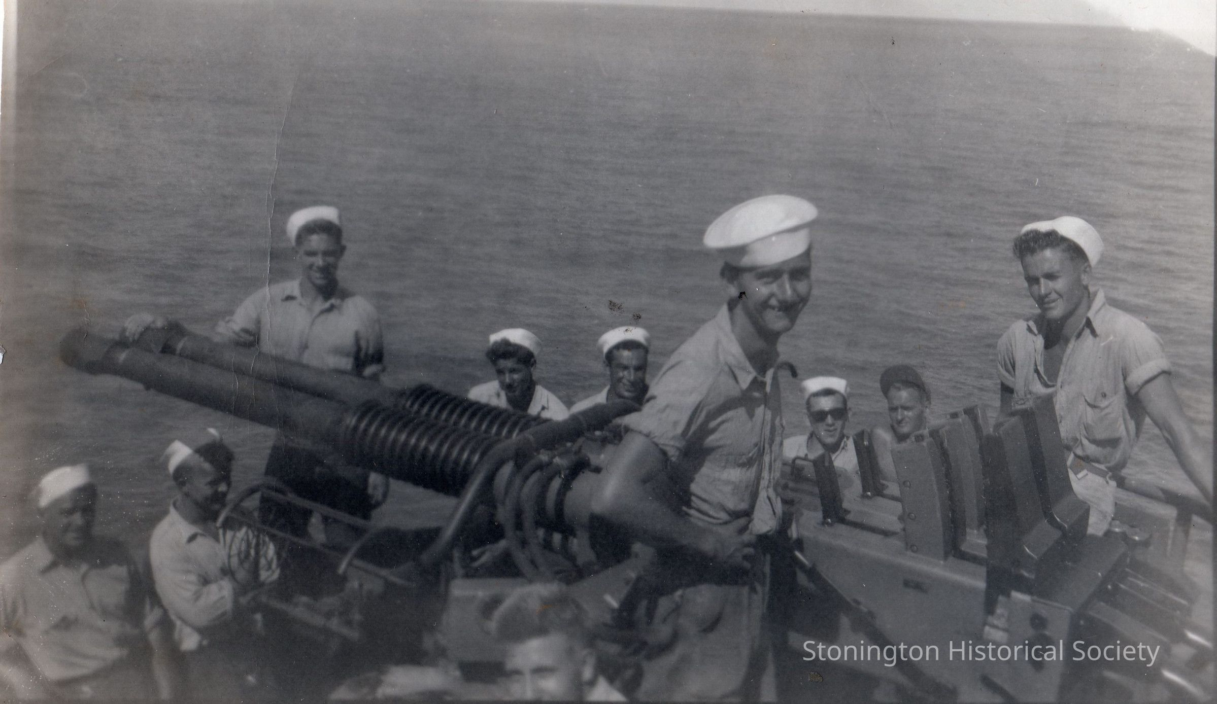 Black and white snapshot from the photograph collections of Frederick Eugene Weeks. Handwritten on back: "PICTURE OF THE GUNNERY DIVISION - TWIN 40 MM". Weeks was born in Stonington on March 16, 1922 and served with the U.S. Navy in the Pacific theater during WWII.