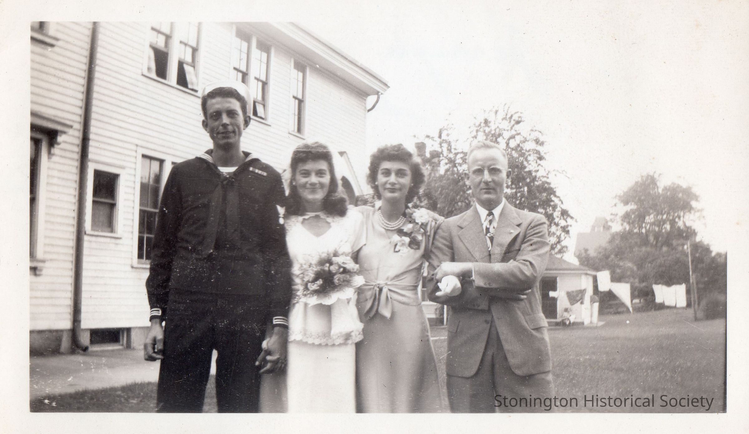 Black and white snapshot from the photograph collections of Frederick Eugene Weeks. Handwritten on back: "Jerry's sister & brother in law, Best man & Bridesmaid, Sep 5 1945". Weeks was born in Stonington on March 16, 1922 and served with the U.S. Navy in the Pacific theater during WWII.
