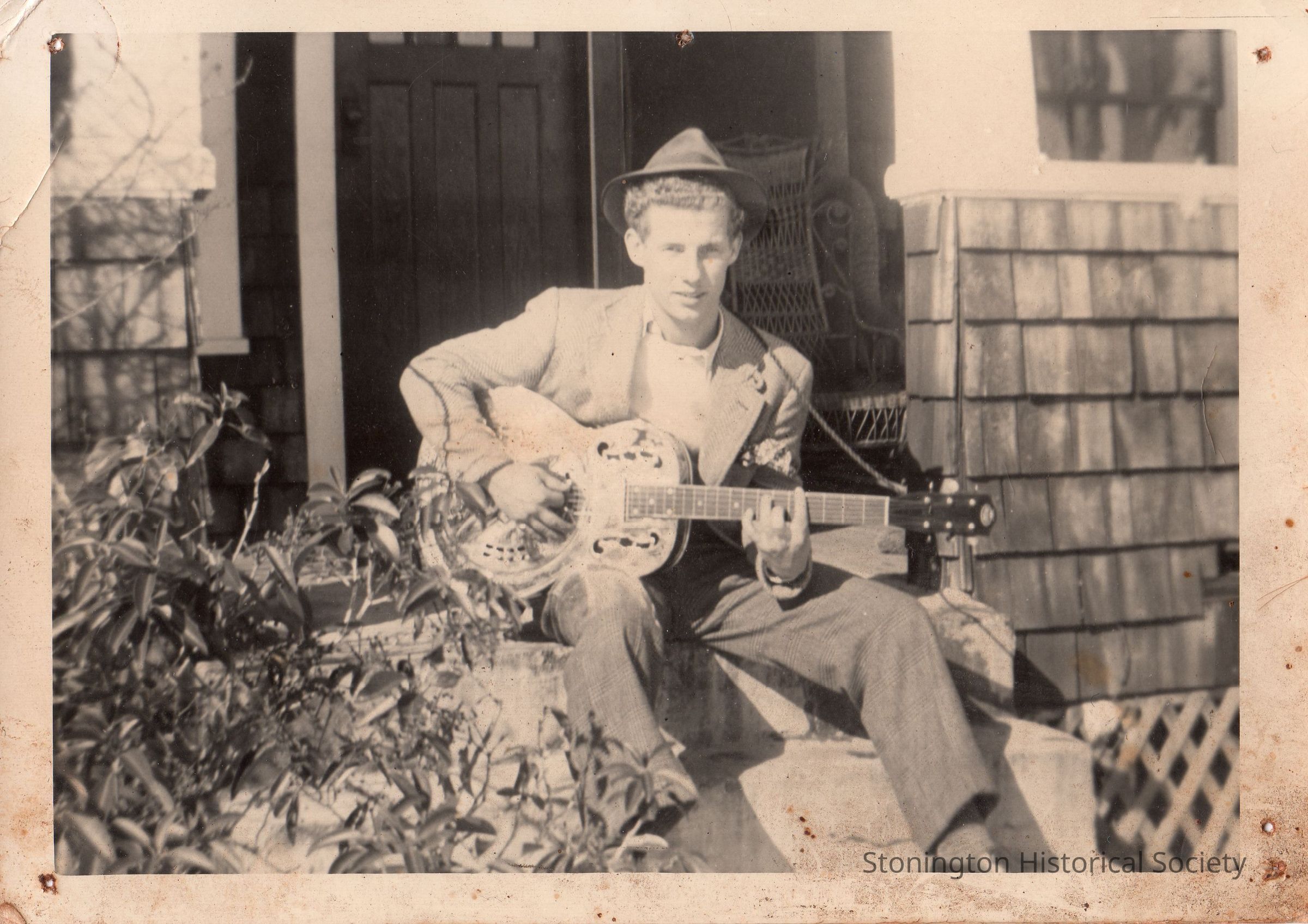 Black and white snapshot from the photograph collections of Frederick Eugene Weeks. Handwritten on back: "To my Pal, from Jr." (Appears to be the same house and young man seen in 2023.644.22). Weeks was born in Stonington on March 16, 1922 and served with the U.S. Navy in the Pacific theater during WWII.