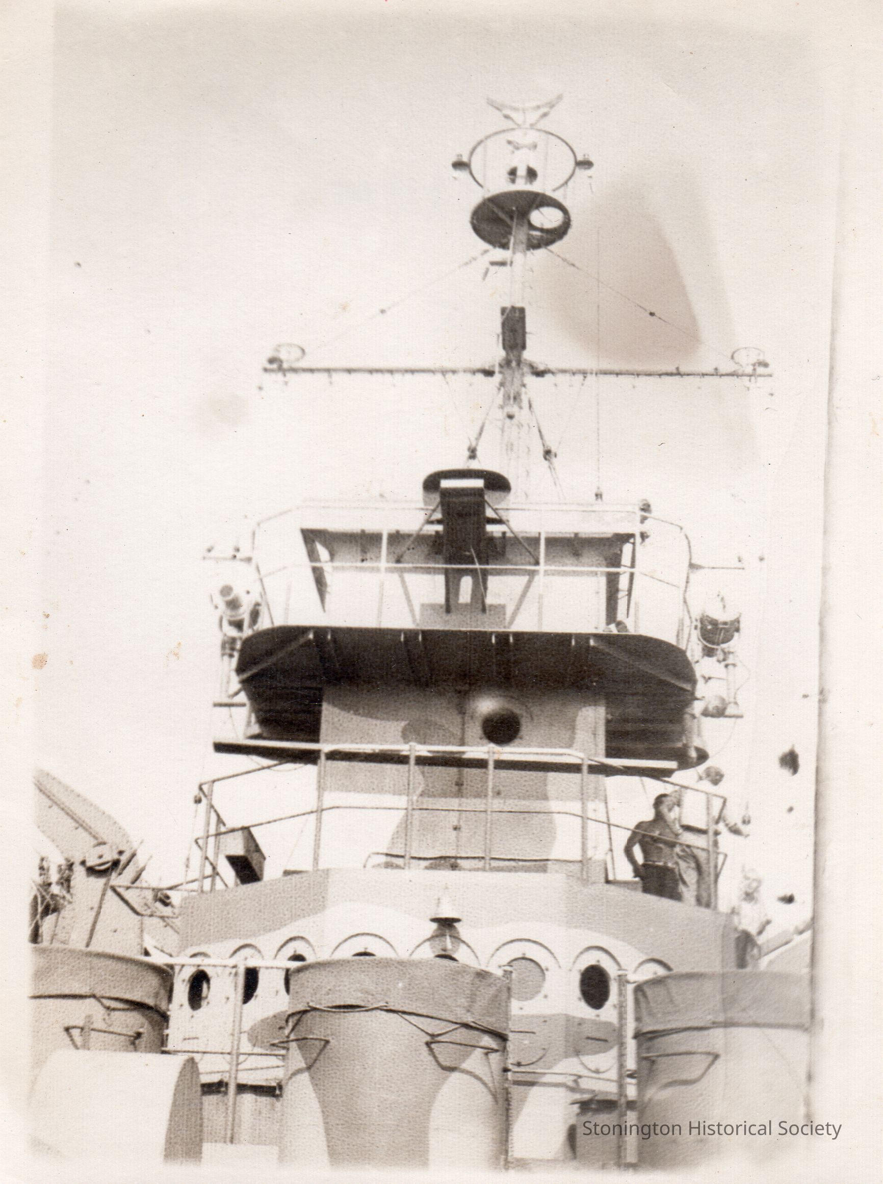 Black and white snapshot from the photograph collection of Frederick Eugene Weeks. Handwritten on the back: "Shot of the "CONN" From the main deck." Weeks was born in Stonington on March 16, 1922 and served with the U.S. Navy in the Pacific theater during WWII.