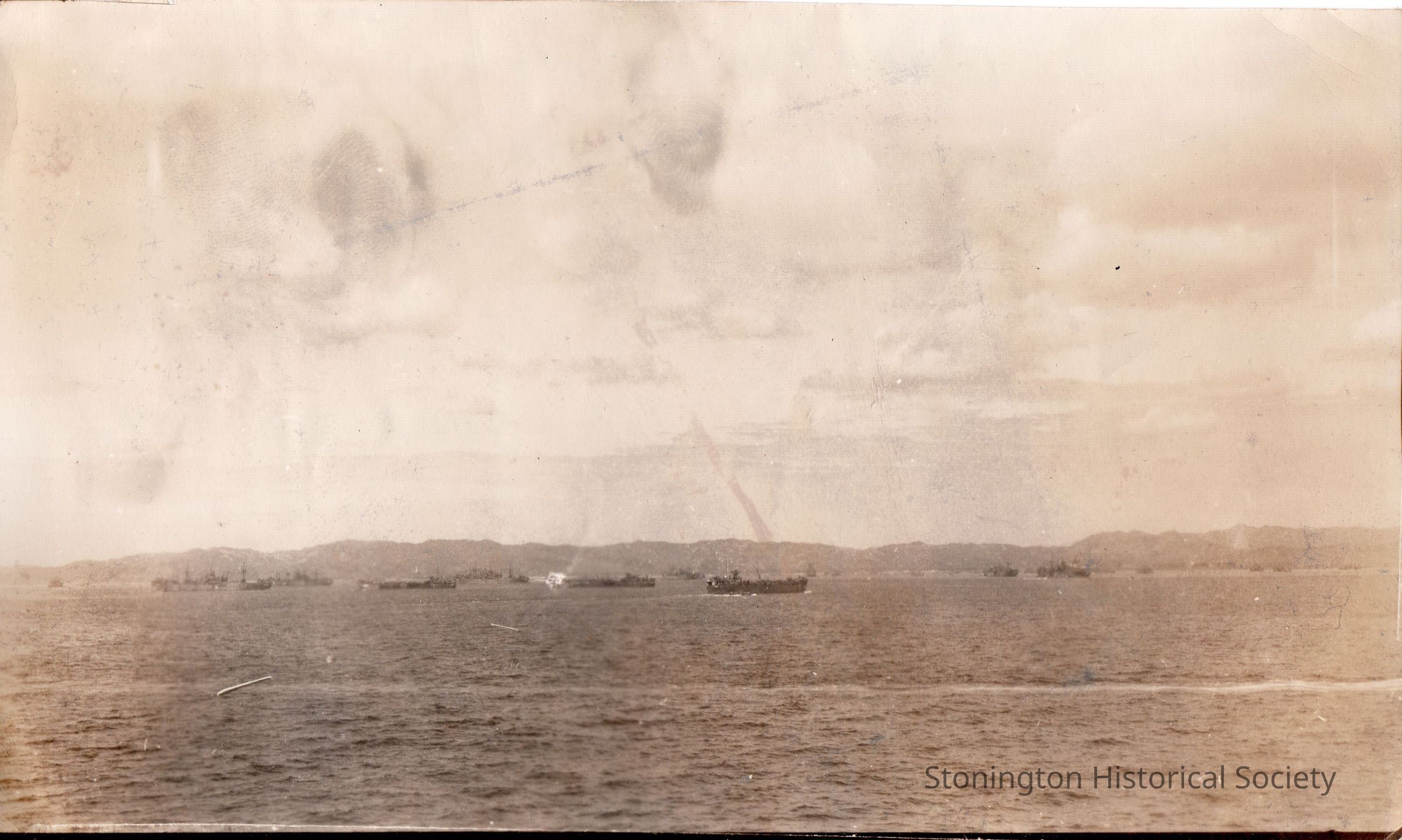 Black and white snapshot from the photograph collections of Frederick Eugene Weeks. Handwritten on back: "This is WAKAYAMA harbor, where we were anchored. It doesn't show much, but you can see some of the ships used for occupation. (It is one of the best harbors I've seen, so far)." Weeks was born in Stonington on March 16, 1922 and served with the U.S. Navy in the Pacific theater during WWII.