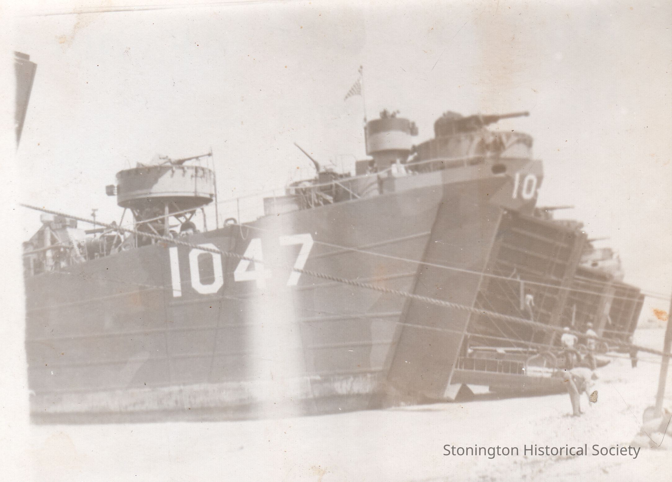Black and white snapshot from the photograph collection of Frederick Eugene Weeks. Handwritten on back: "ANOTHER SHOT OF OUR SHIP AT GUAM." Weeks was born in Stonington on March 16, 1922 and served with the U.S. Navy in the Pacific theater during WWII.
