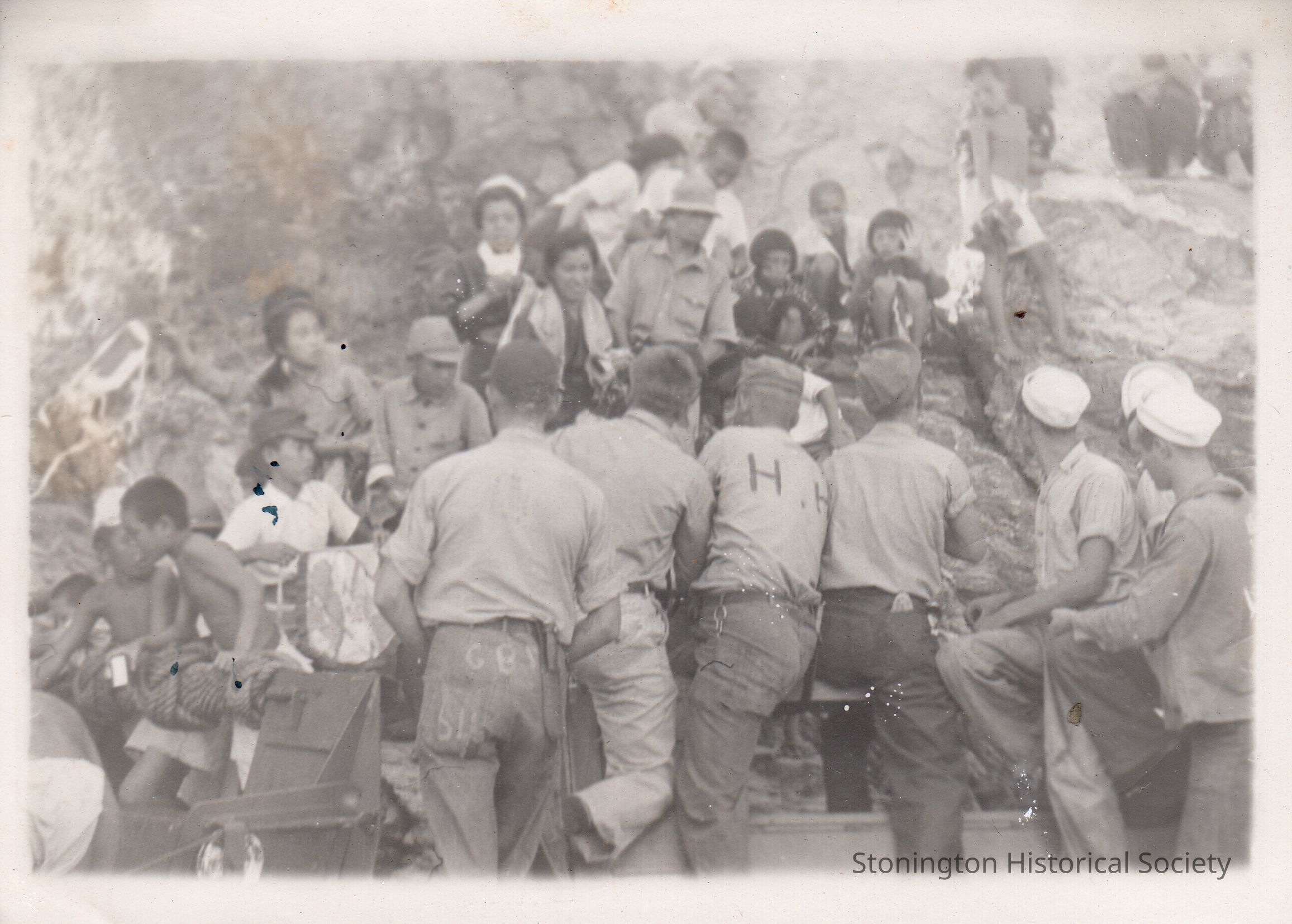 Black and white snapshot from the photograph collection of Frederick Eugene Weeks. Handwritten on back: " Some of our guys on the beach; taking pictures and trying to talk to the jerks." Weeks was born in Stonington on March 16, 1922 and served with the U.S. Navy in the Pacific Theater during WWII.