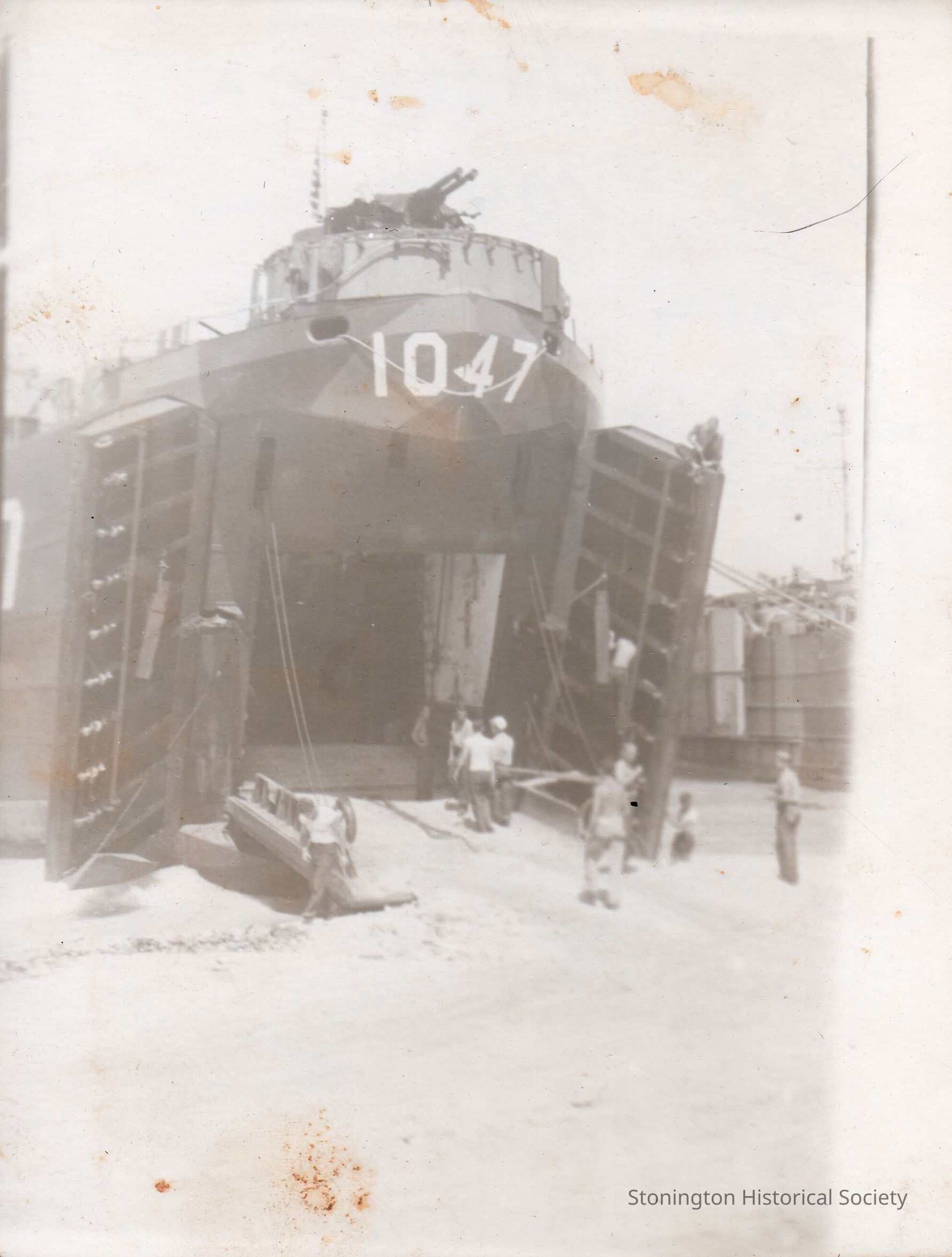 Black and white snapshot of a WWII battlecruiser taken by Fred Weeks. Handwritten on back: "Bow doors of old "1047" - Taken at Guam when we unloaded our cargo ammo..." Weeks was born in Stonington on March 16, 1922 and served in the Pacific theater with the U.S. Navy.