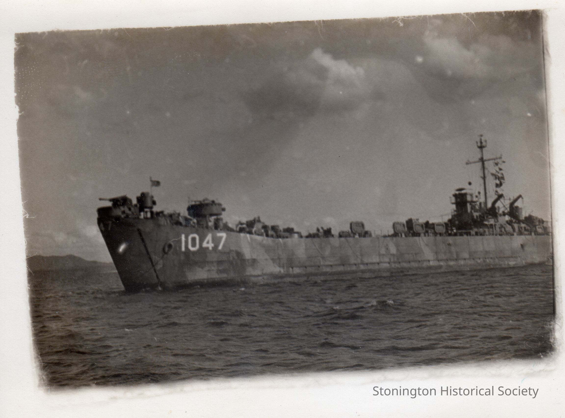 Black and white snapshot from the photograph collection of Frederick Eugene Weeks. Handwritten on back: "A GOOD PICTURE OF 1047 AT OKINAWA." Weeks was born in Stonington on March 16, 1922 and served with the U.S. Navy in the Pacific theater during WWII.