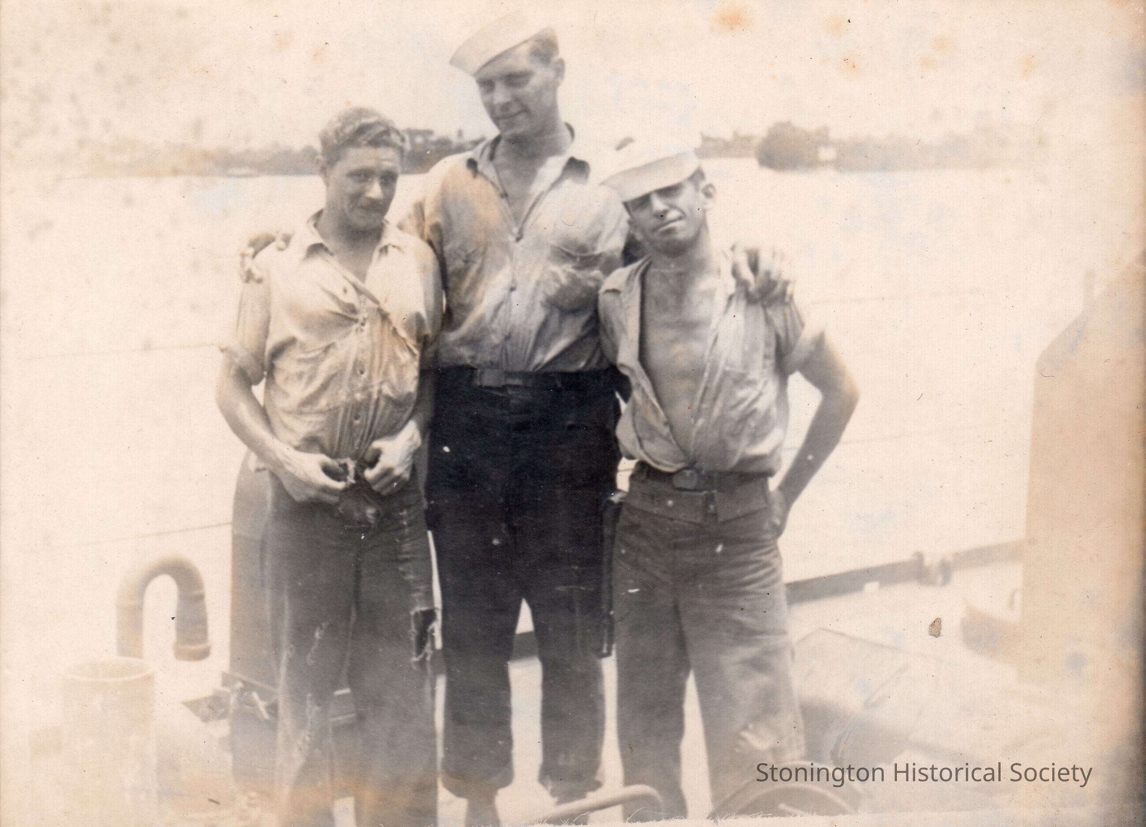 Black and white snapshot from the photograph collection of Frederick Eugene Weeks. Handwritten on back: "BOS'N MATES! SALTY CHARACTERS." Weeks was born in Stonington on March 16, 1922 and served with the U.S. Navy in the Pacific theater during WWII.