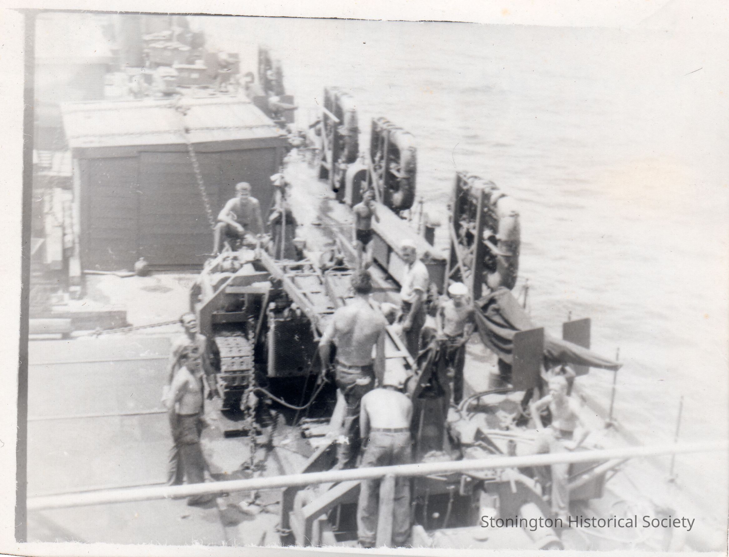Black and white snapshot from the photograph collections of Frederick Eugene Weeks. Handwritten on back: "VIEW OF THE MAIN DECK, HOUSE WAS FULL OF INCENDIARIES." Weeks was born in Stonington on March 16, 1922 and served with the U.S. Navy in the Pacific theater during WWII.